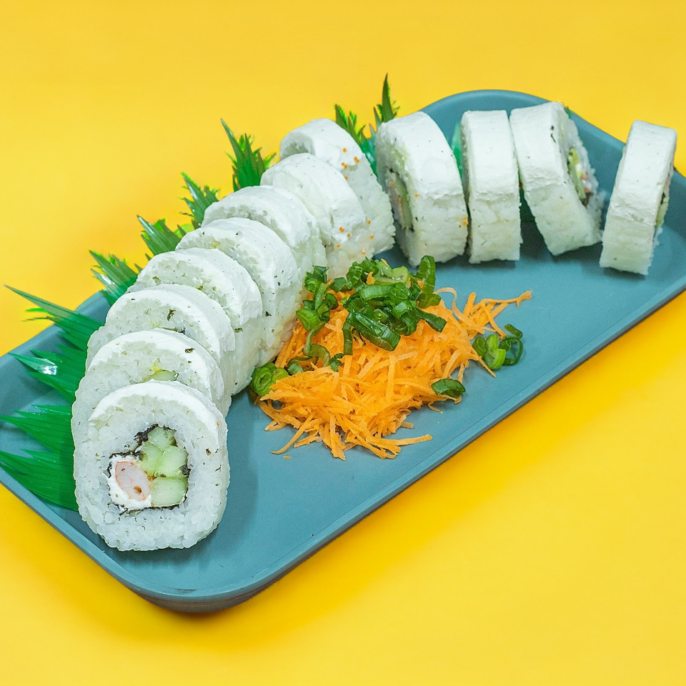 Forrado con hueva de pescado, relleno de pepino ,aguacate, philadelphia y proteina a elegir.
