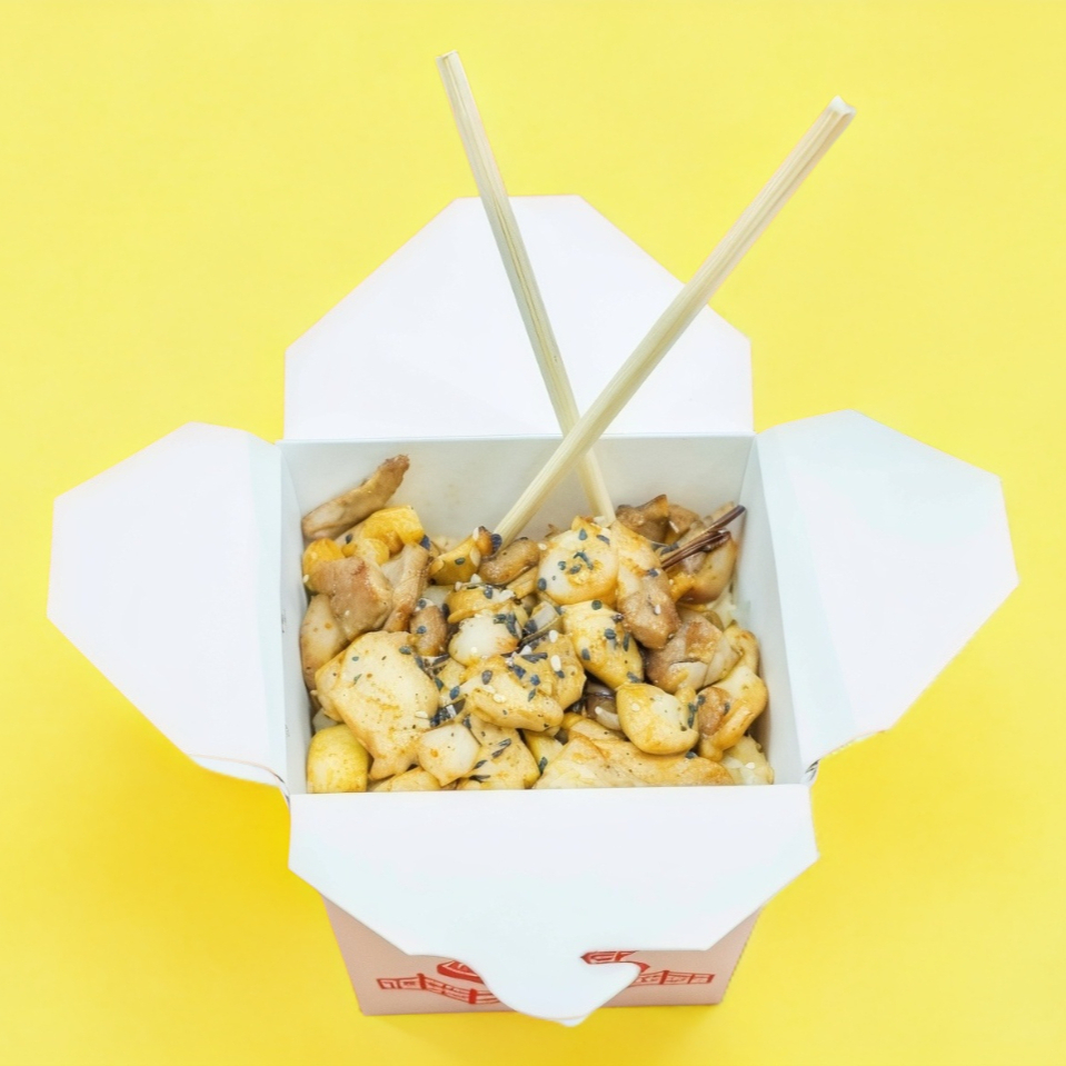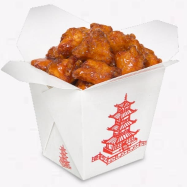 Cajita China llena de puro Pollo Capeado bañado en Salsa Agridulce al Orange