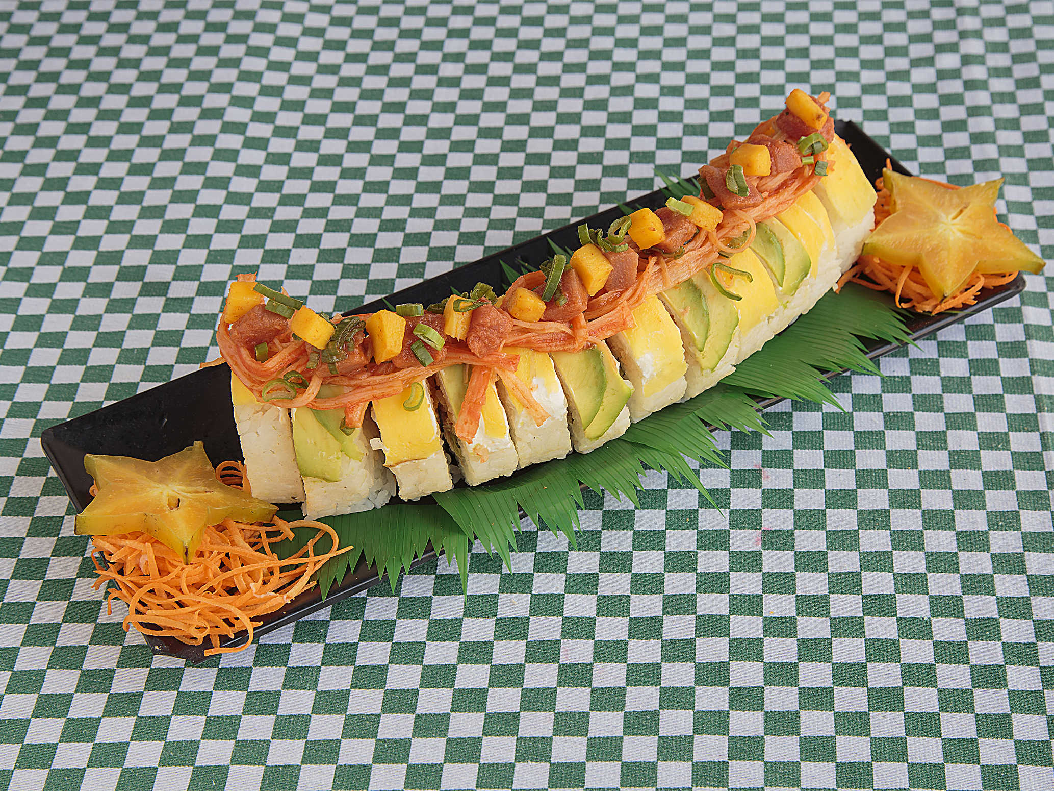 Forrado de Mango 🥭 y Aguacate 🥑 con un topping de ensalada de medallon de atun con mango y kanikama mezclada con sriracha y un toque de limon, por dentro relleno de ensalada de medallon de atun con mango kanikama, philadelphia, pepino y aguacate