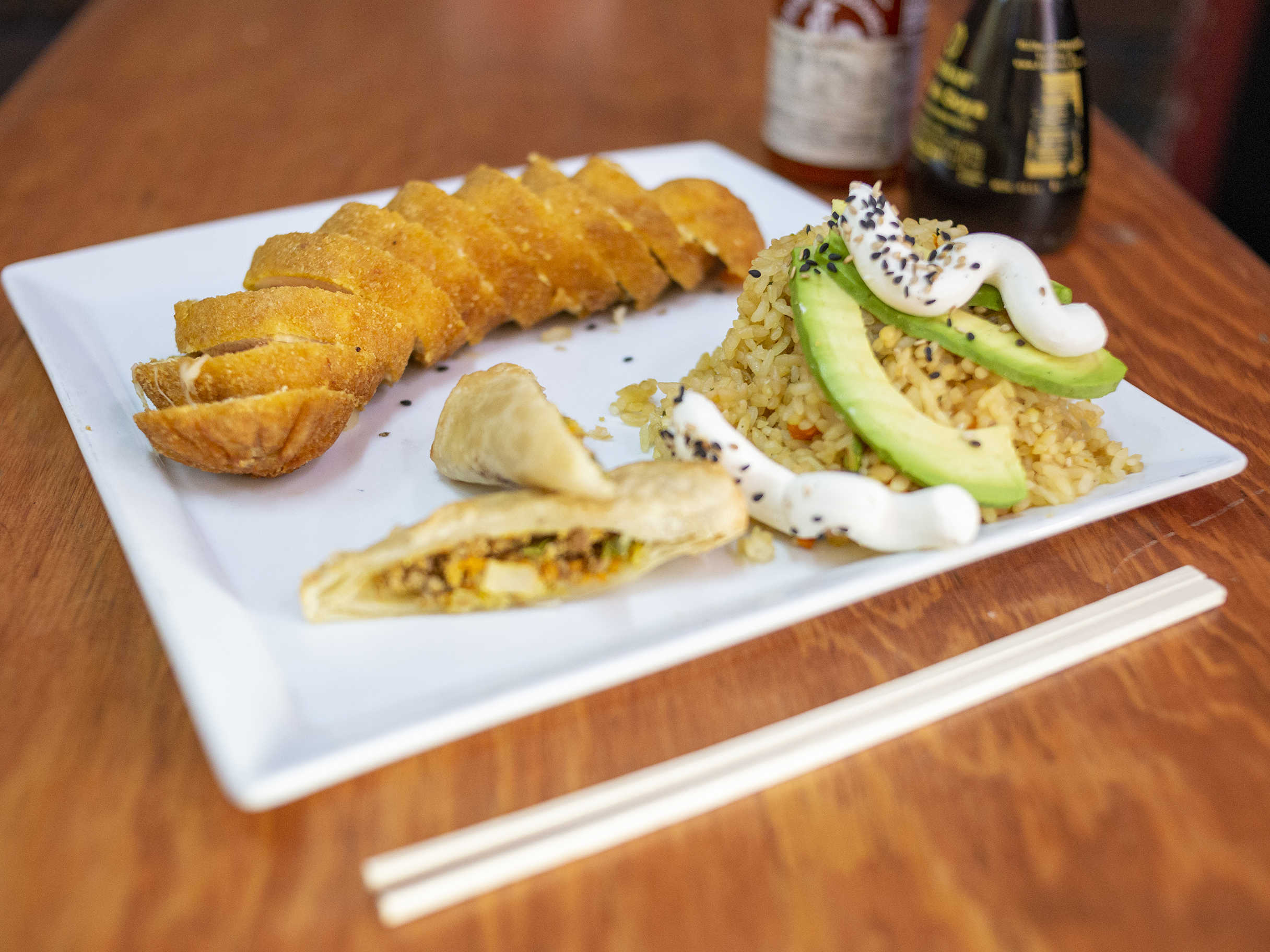 6 camarones empanizado con philadelphia acompañado de yakimeshi o gohan