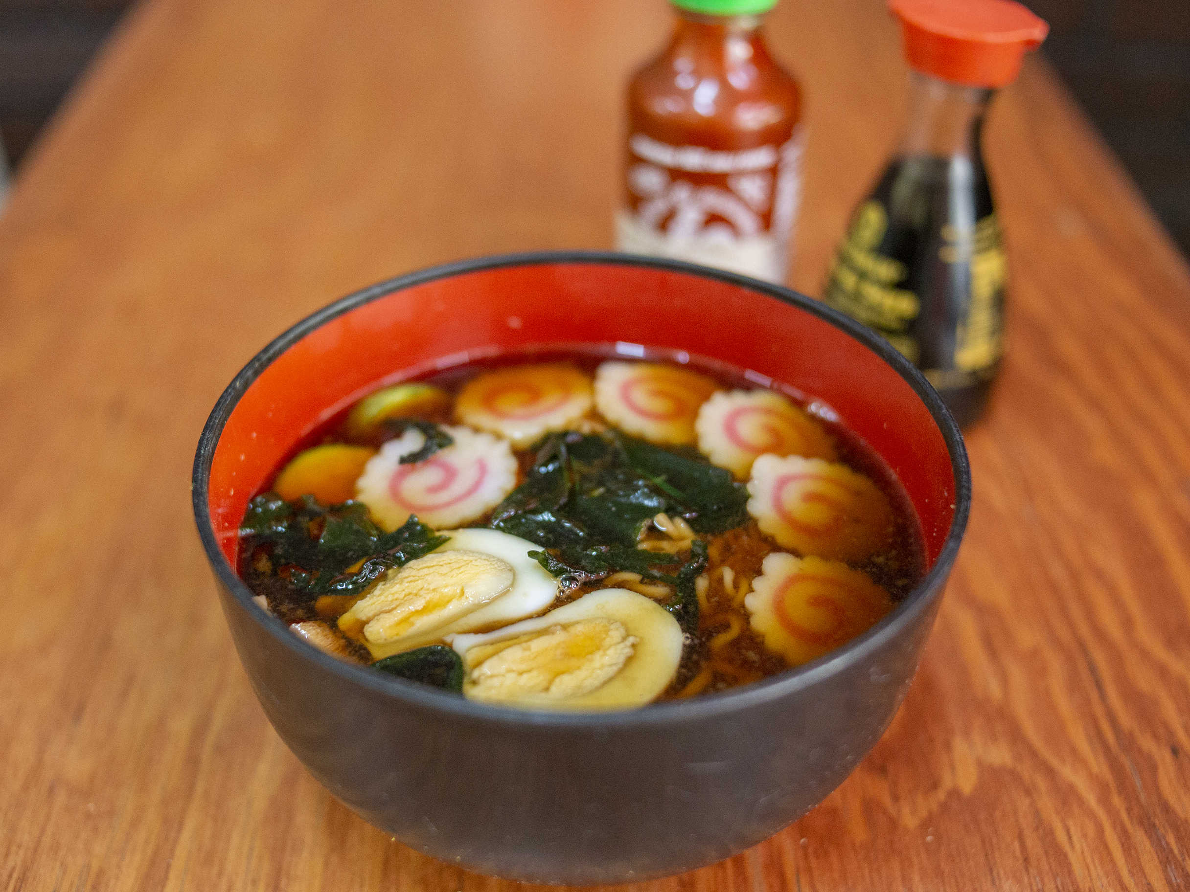 Deliciosa combinación, de pasta ramen, calabaza, zanahoria, huevo cocido, naruto, alga, shitake y miso