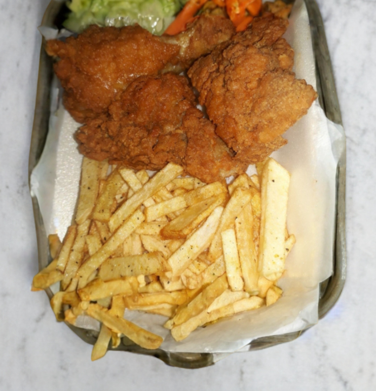 3 piezas de pollo frito bañadas en salsa (BBQ, búfalo, mango habanero o chipotle) acompañadas con papas a la francesa