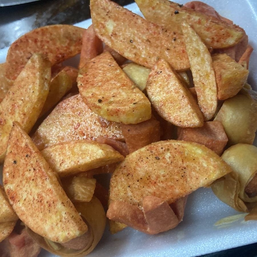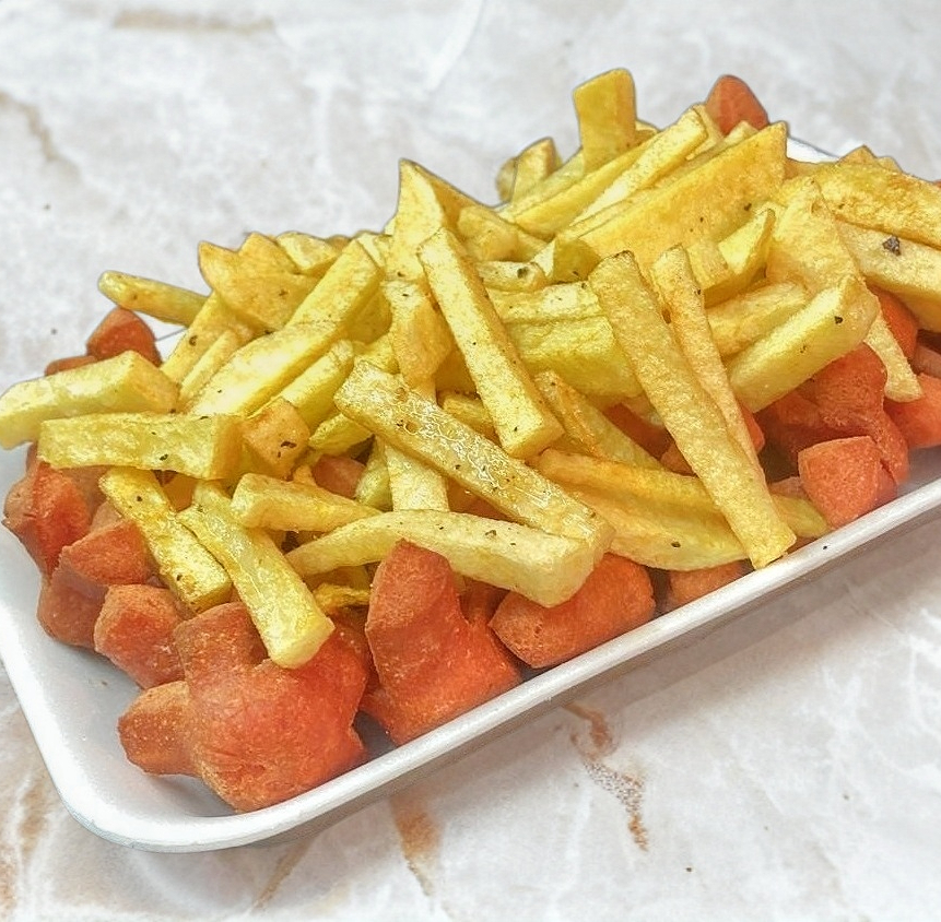 Salchicha frita + pastor, piña, cebolla guisada y queso fundido + papas a la francesa