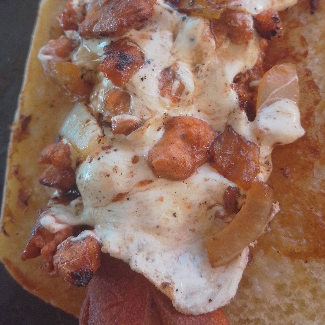 Salchicha frita + tocino, champiñones, cebolla guisada y queso fundido