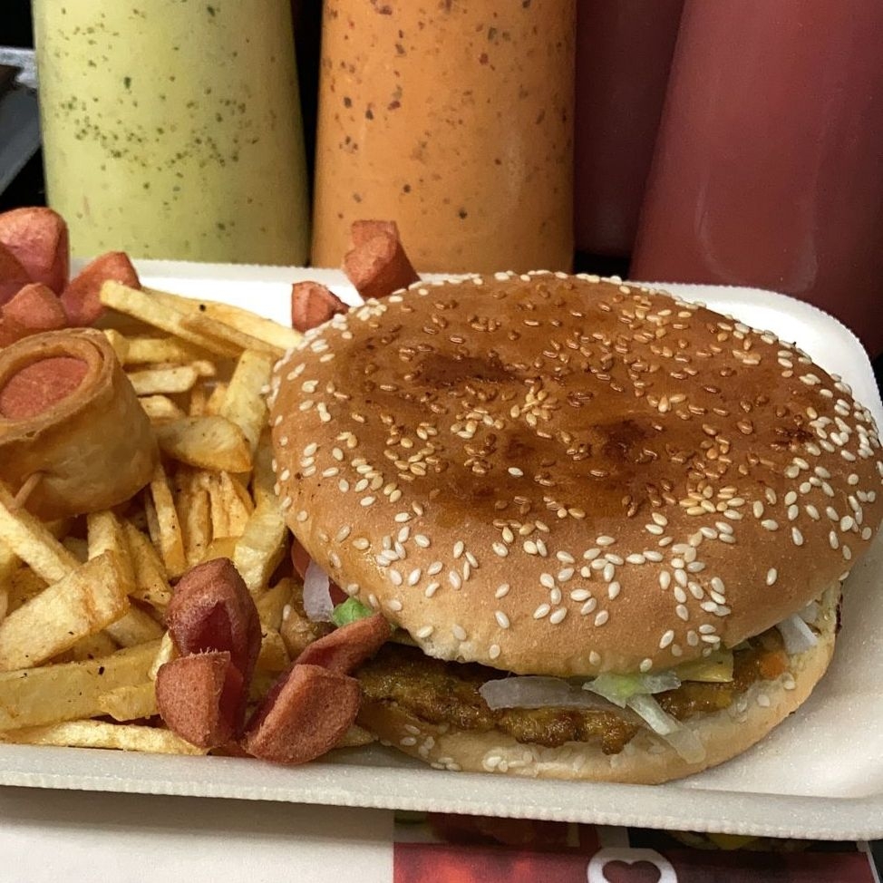 Carne de hamburguesa + tocino dorado y queso fundido + papas a la francesa