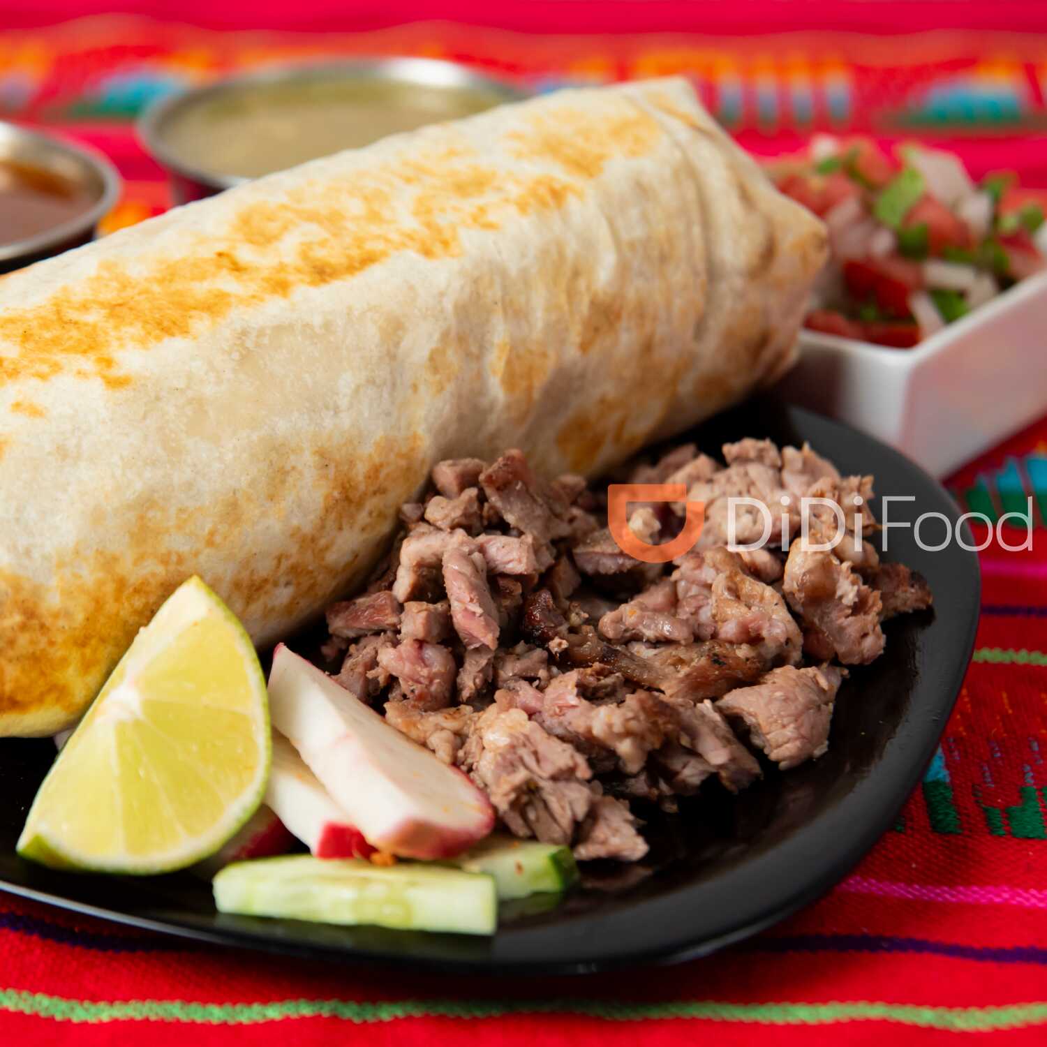barbacoa tradicional en una tortilla de harina 30cm con queso fundido, limon, verdurita y salsa picante aparte