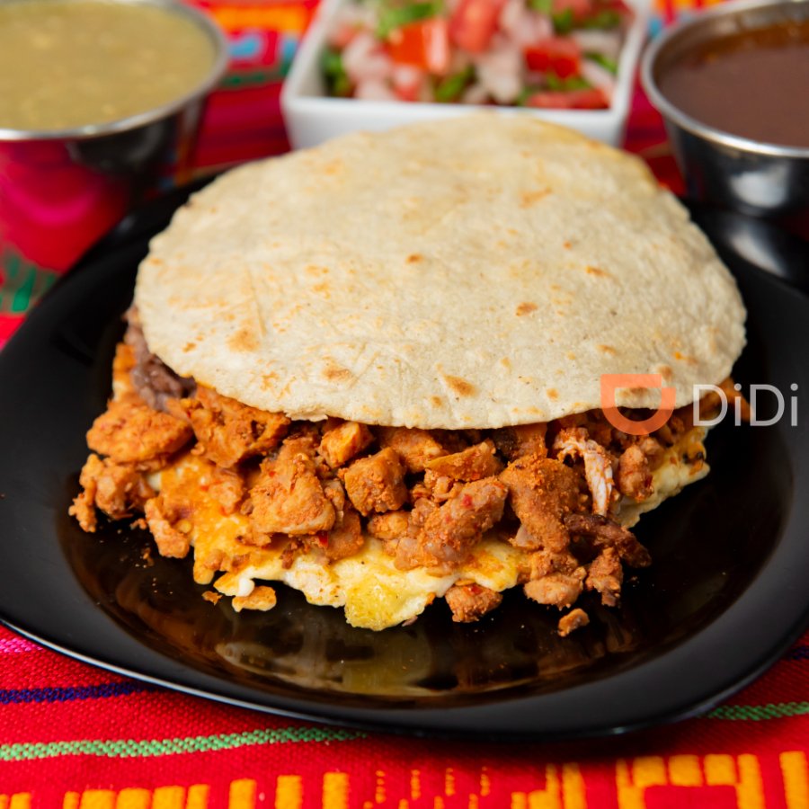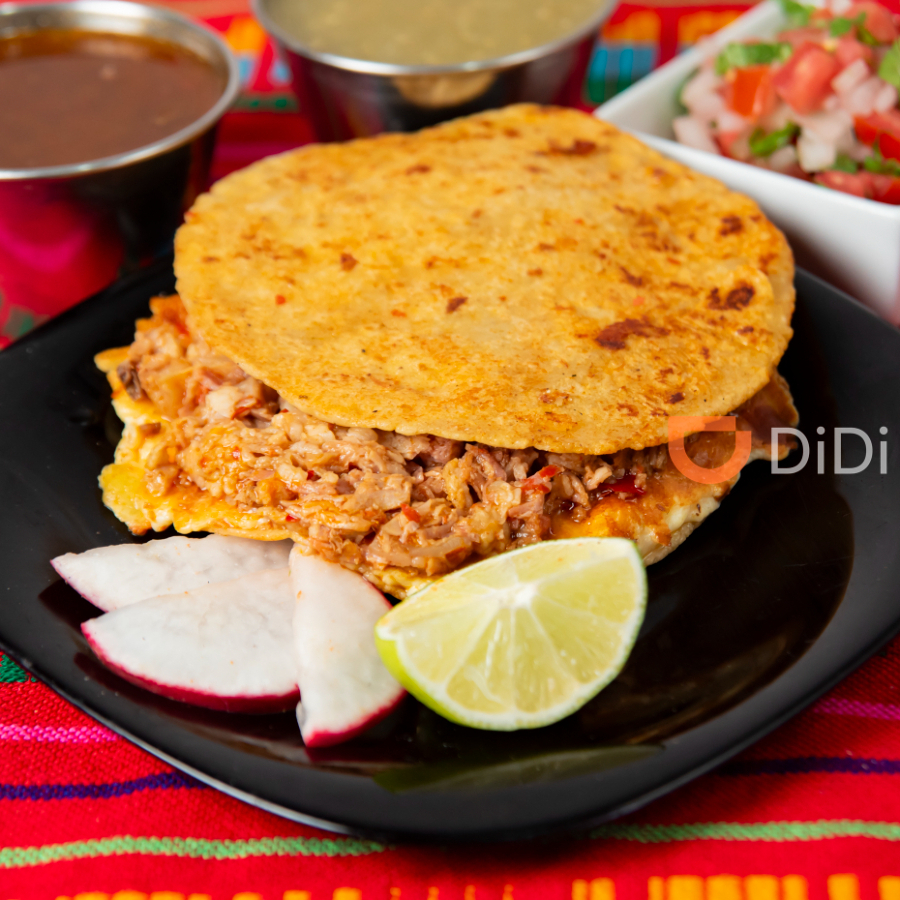en tortilla doble de maiz con queso fundido salsas y verdura aparte