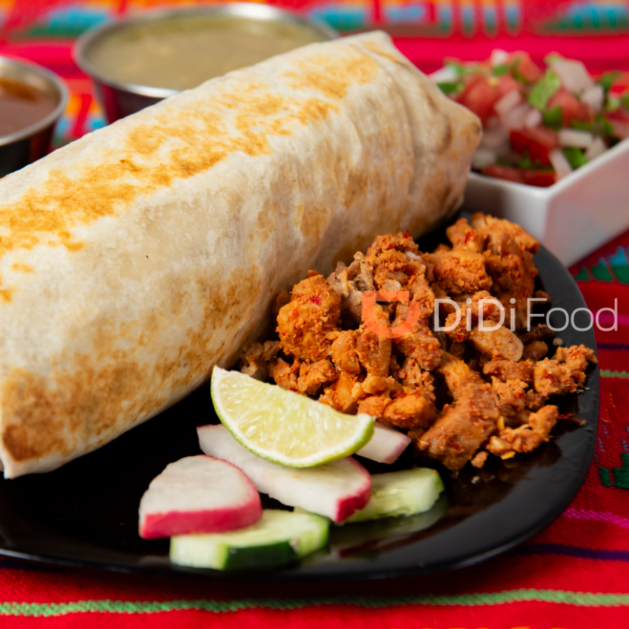 barbacoa tradicional en tortilla grande de harina 30cm con queso fundido, verdurita y picante aparte