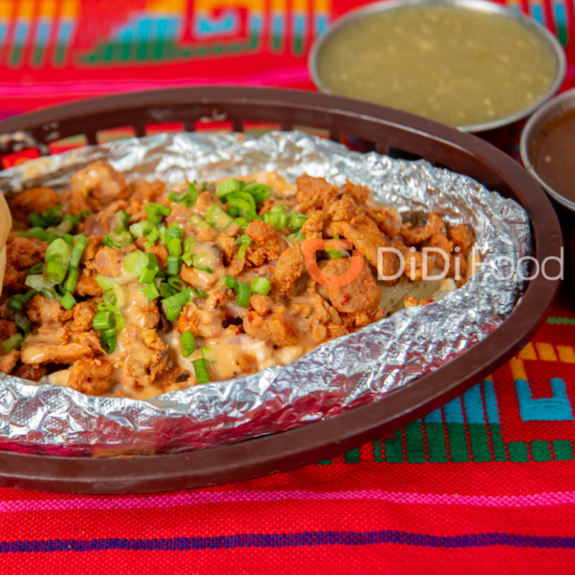 carne elegida en trozos de papa con queso fundido, chipotle, totopos y salsa picante aparte