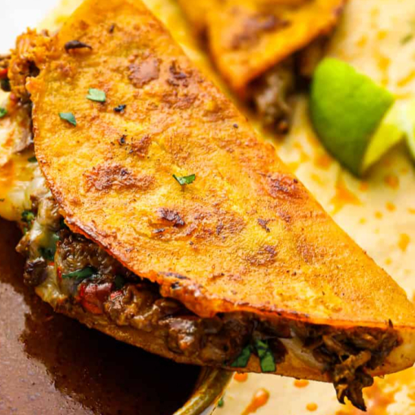barbacoa tradicional en tortilla doble con queso fundido, verdura y picante aparte