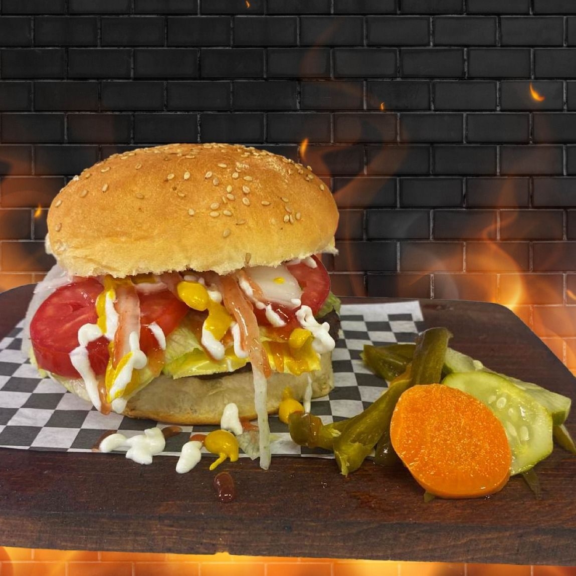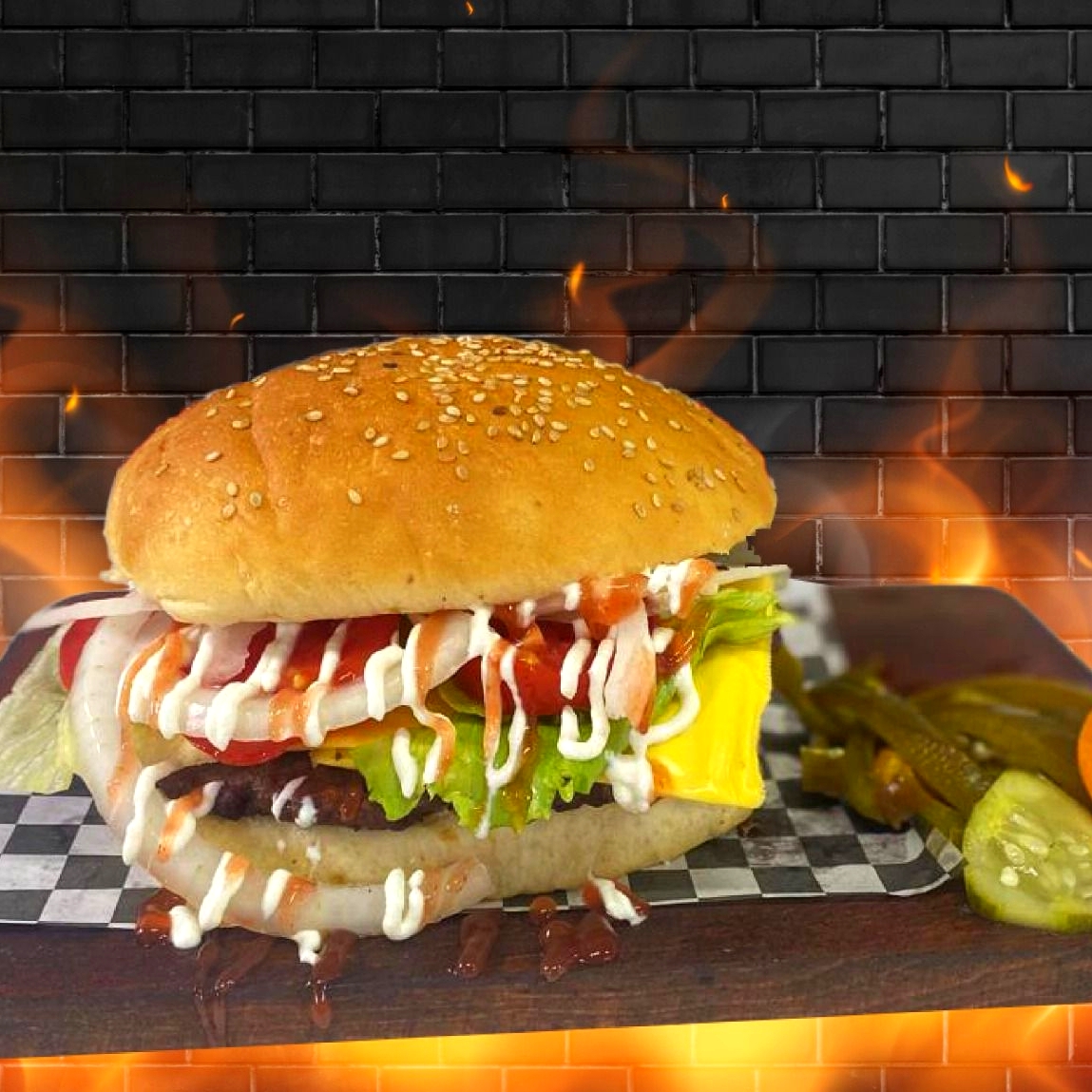 Carne de res 250g tamaño grande 19 cm cocinada al carbón incluye queso verdura como jitomate, cebolla, lechuga, chiles jalapeños y aderezos como catsup, crema, mostaza. Todo se pone aparte para que te la puedas prepar a tu gusto.(verdura y aderezos).