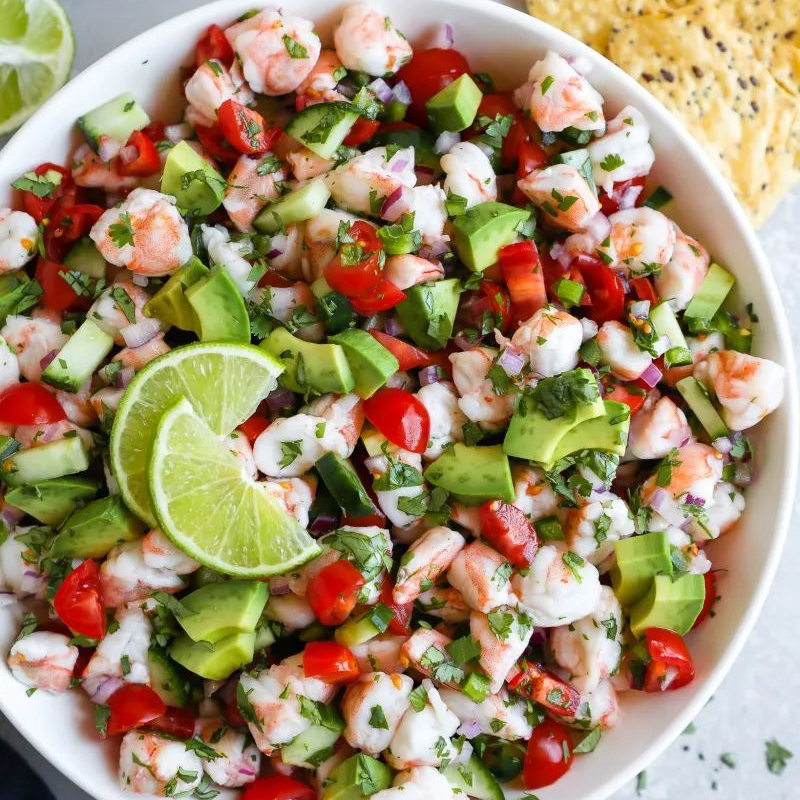 Deliciosa orden de ceviche de camarón estilo Sinaloa curtido con jugoso limón y un toque de jugo de almeja.