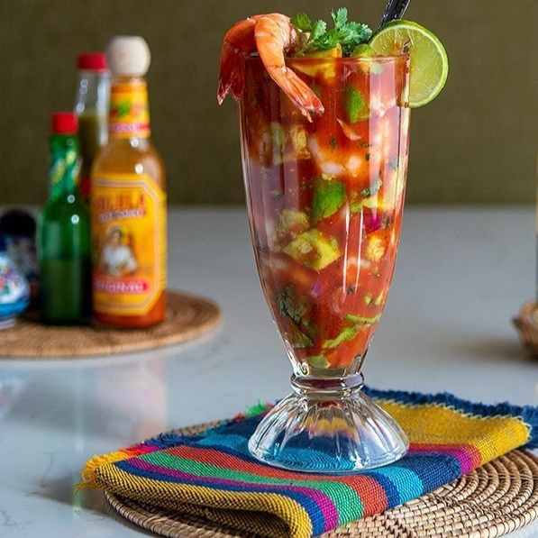 Clásico coctel de camarón estilo Sinaloa con camarones cocidos y jugosos en un rico caldito de camarón acompañado de cilantro fresco, pepino, cebolla morada, jitomate y trozos de aguacate cremoso.