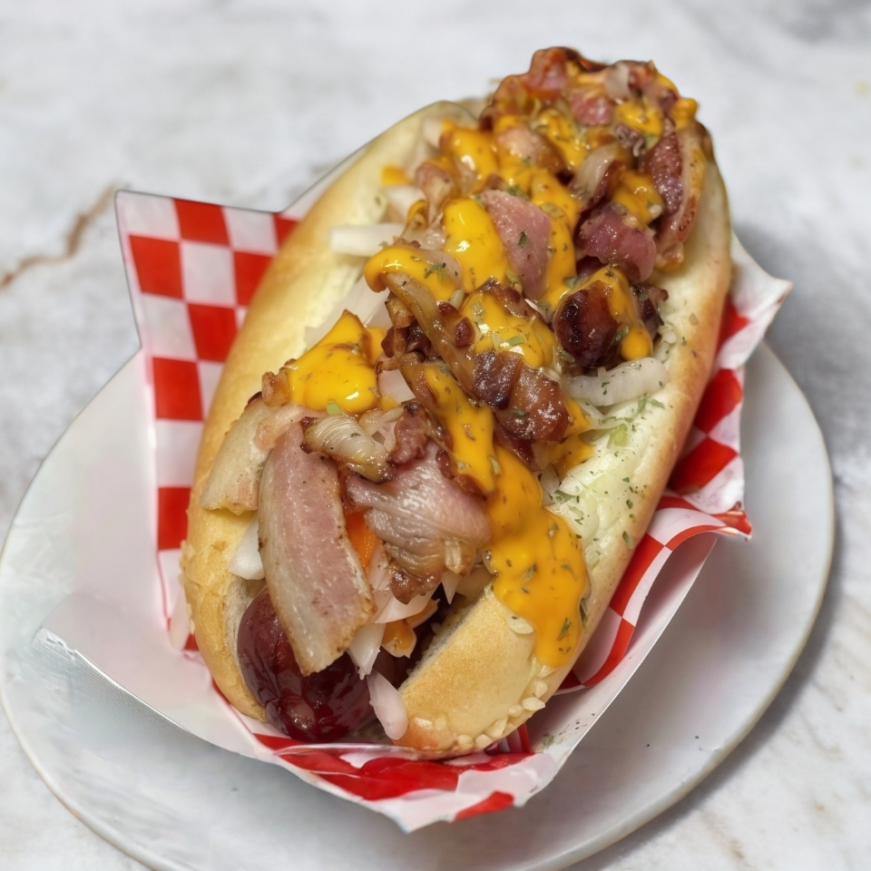 Delicioso Hot Dog de salchicha viena envuelto en tocino y chorizo con queso . Preparalo a tu gusto