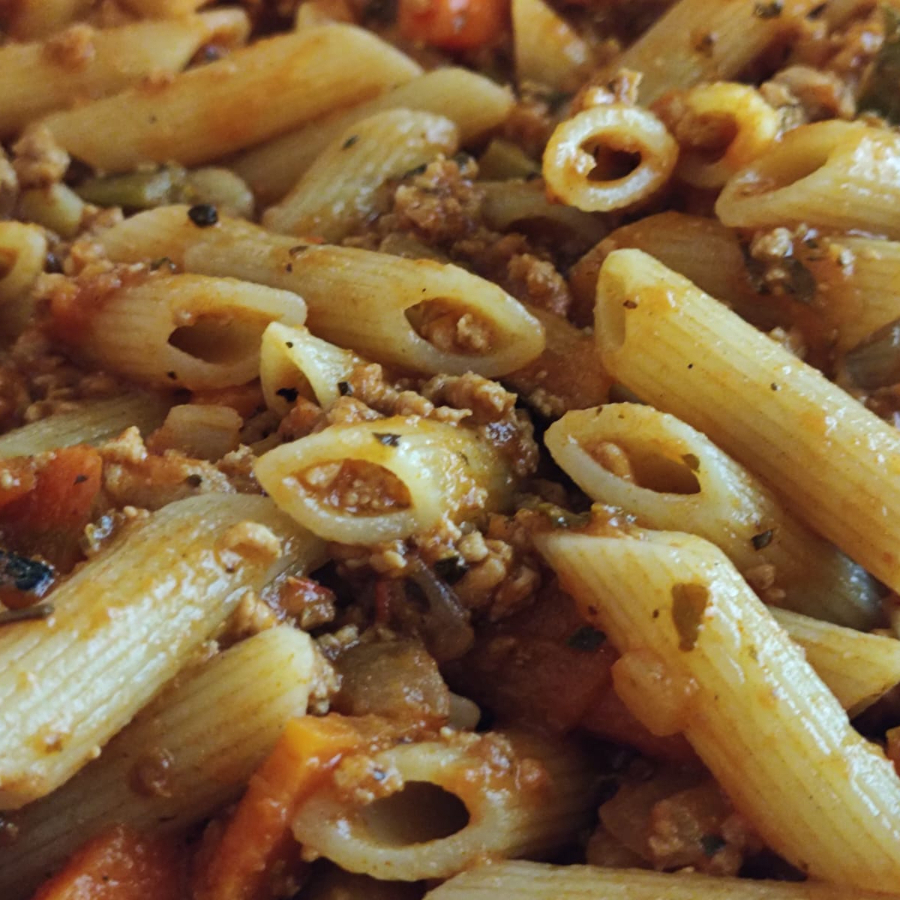 Pasta Pluma rayada con salsa bolognesa coronada con queso parmesano, acompañado con pan con mantequilla y chimichurri de la casa...