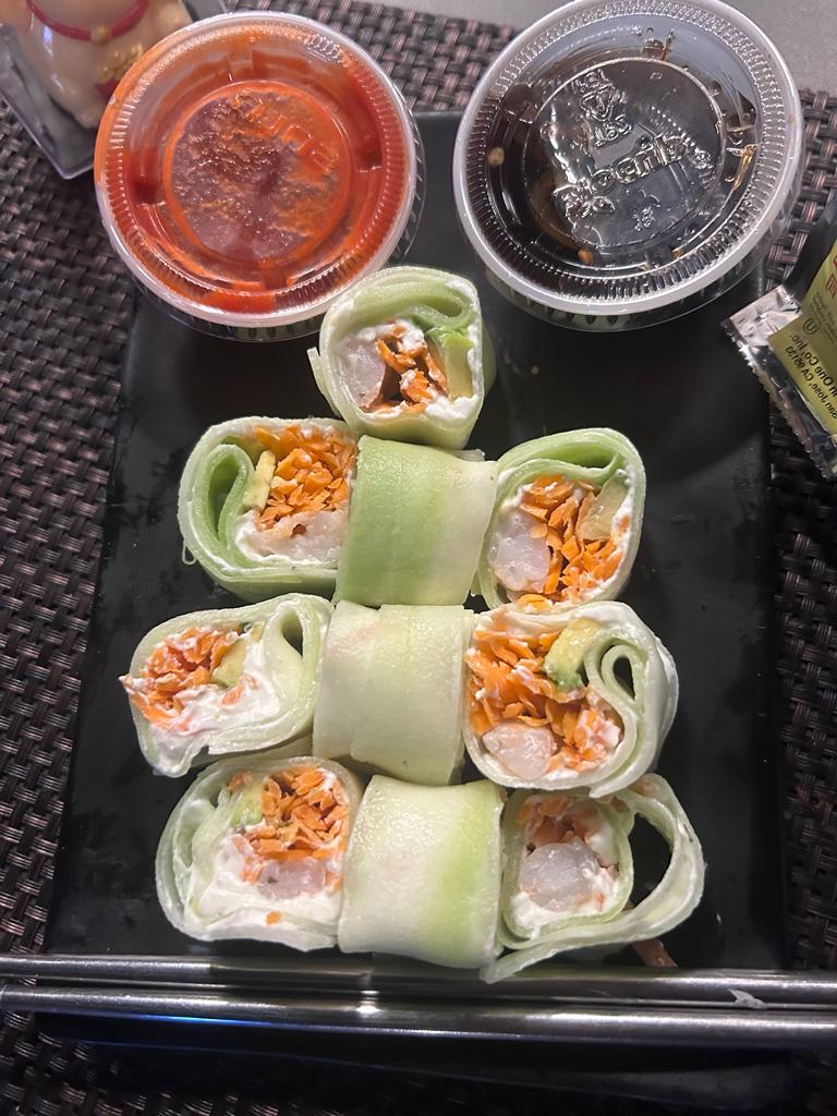 Delicios rollo por dentro arroz, pepino, zanahoria, philadelphia y camarón por fuera pepino, coronado con chile Tajín