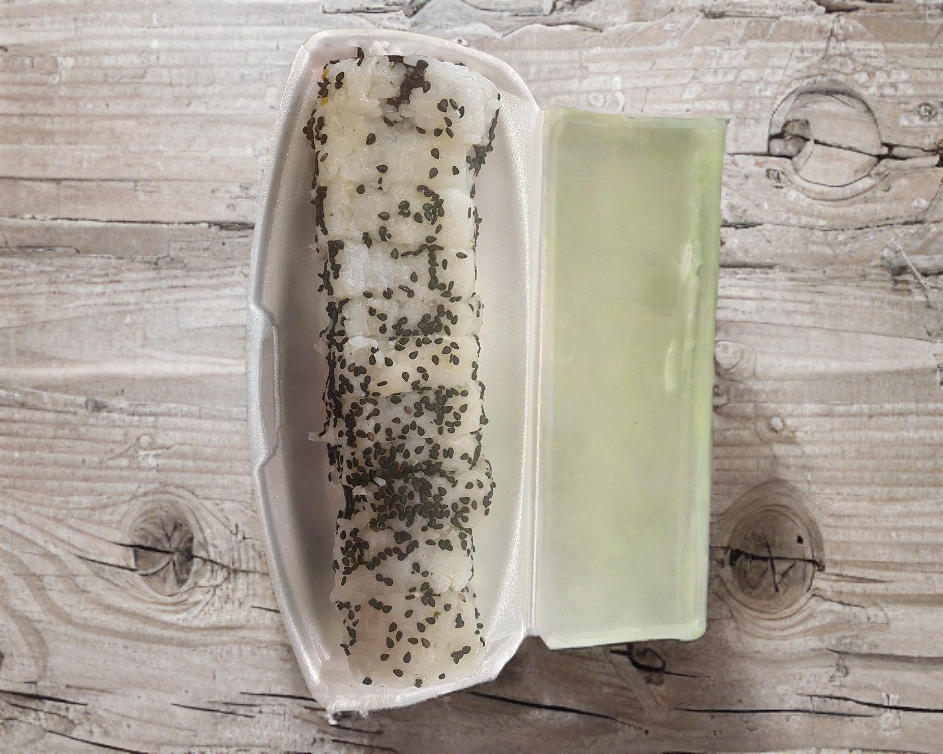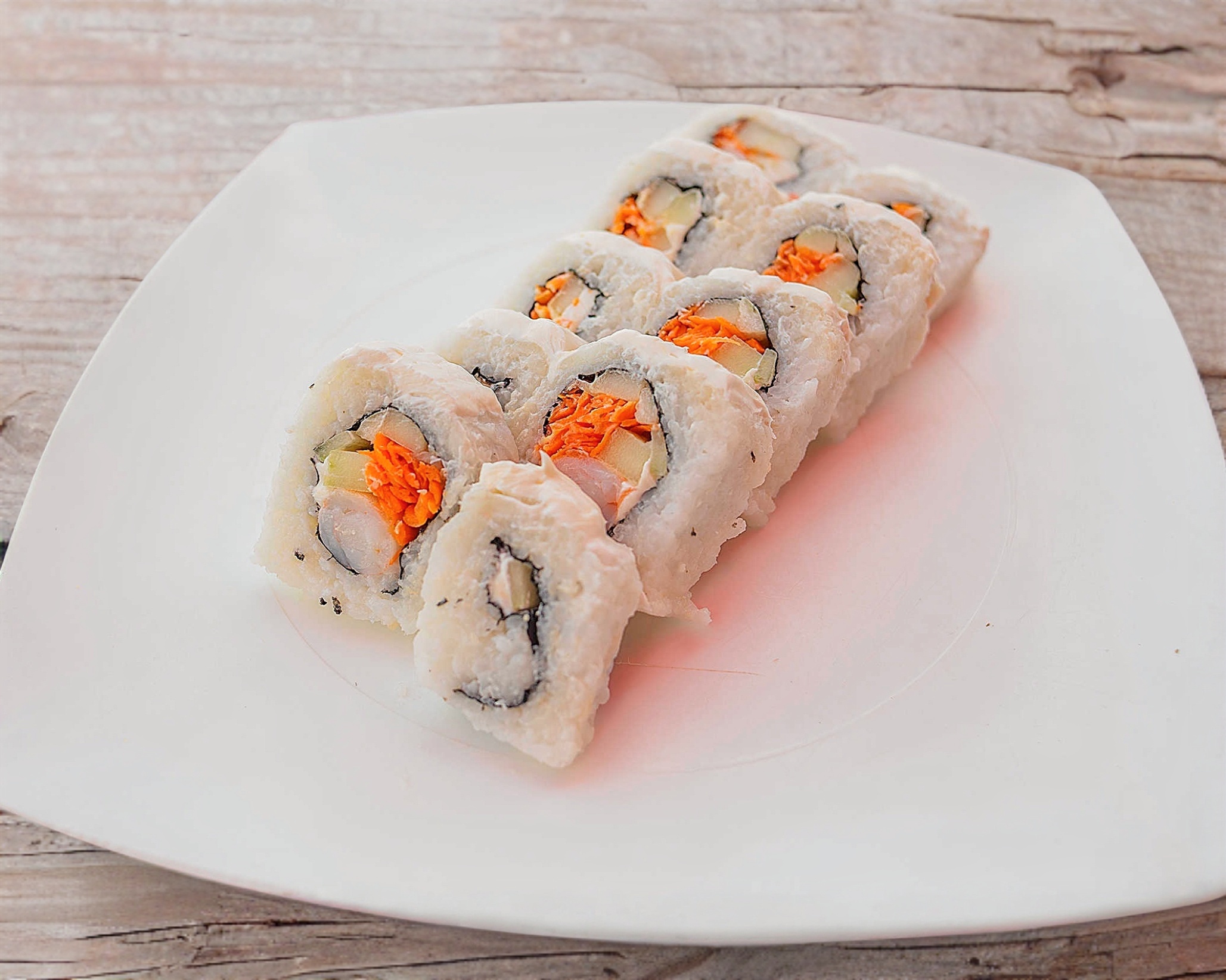 Por dentro camaron, pepino, zanahoria, philadelphia por fuera surimi y philadelphia