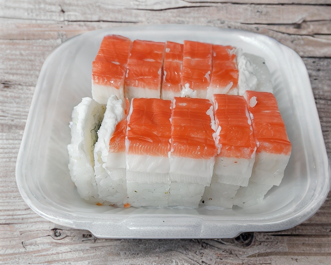 Por dentro Philadelphia, pepino, zanahoria, camarón, y por fuera philadelphia y salmon