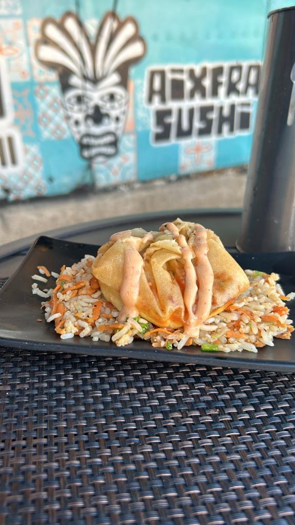 Arroz frito con camarones empanizados y aderezo de chipotle