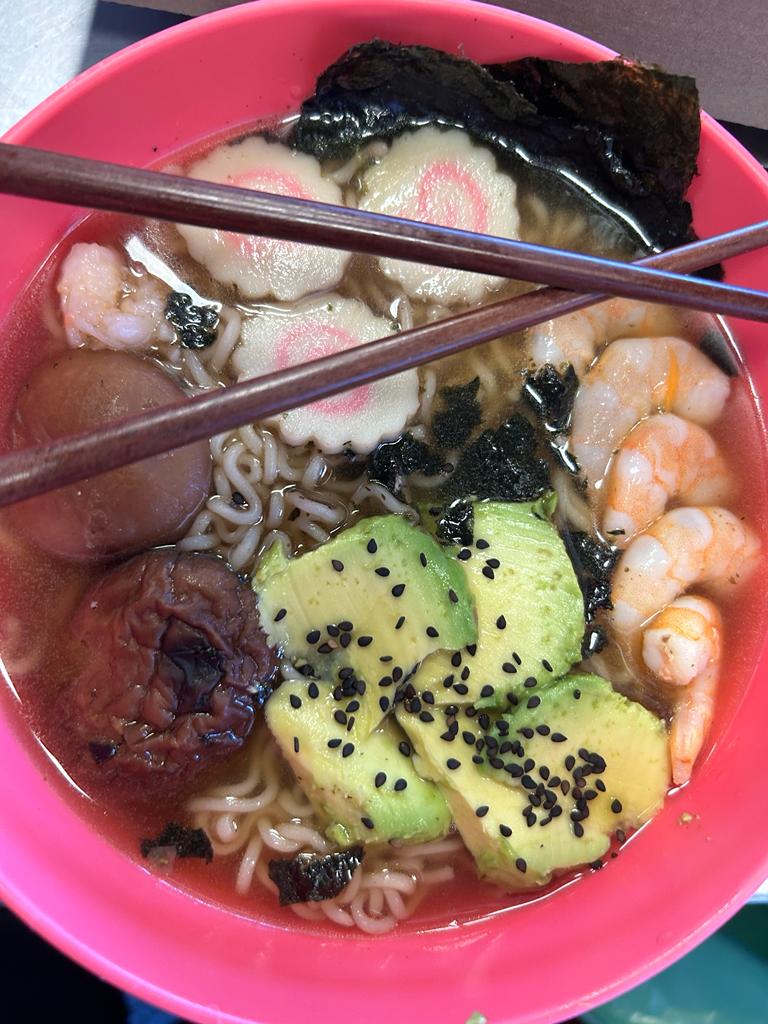 Por dentro Philadelphia, pepino, zanahoria, camarón, alga por fuera y coronado con ensalada picosita