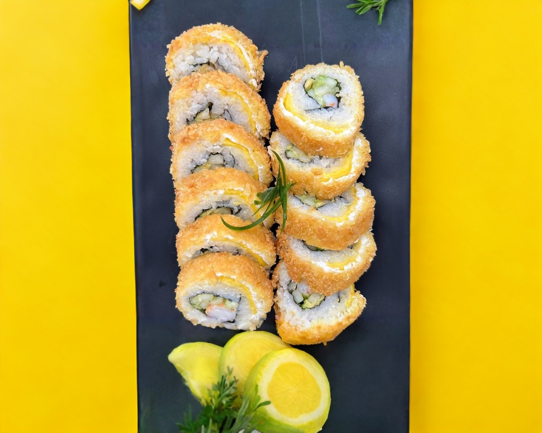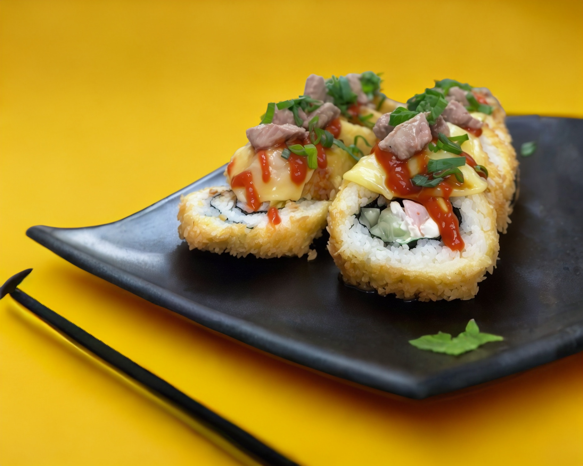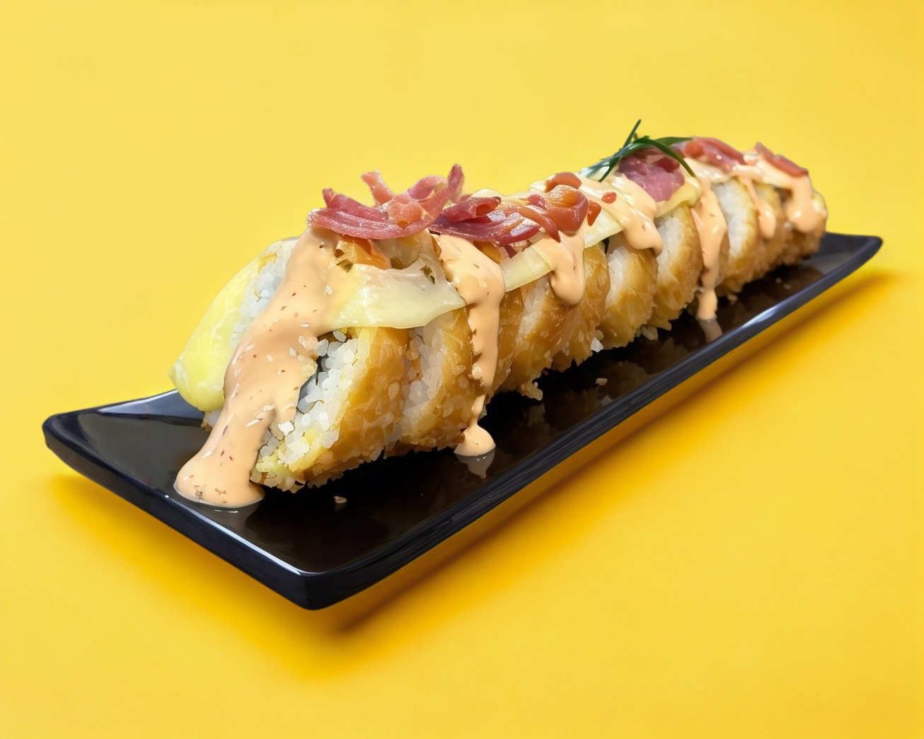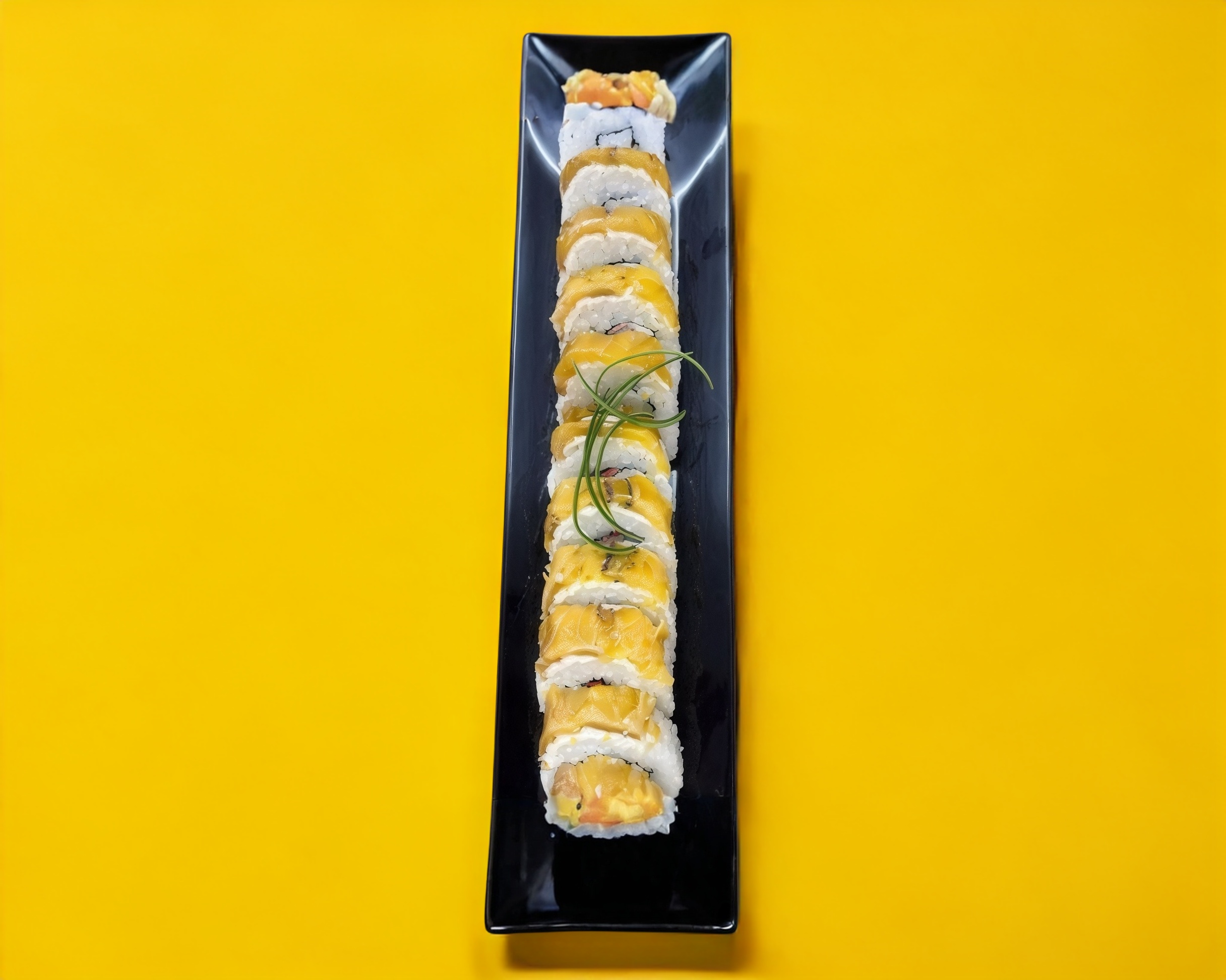 Sushi gigante empanizado por fuera, por dentro aguacate, pepino, philadelphia, camarón y tocino. Por fuera coronado con queso gratinado, res, salsa de anguila sriracha y cebollín