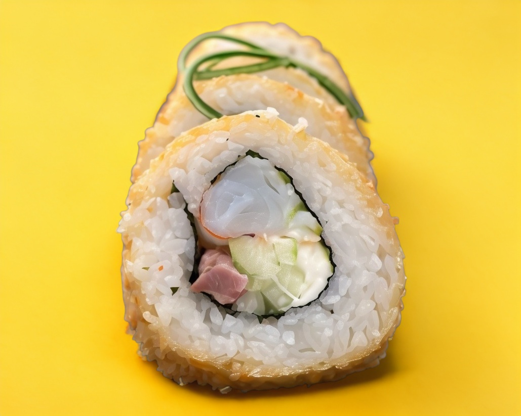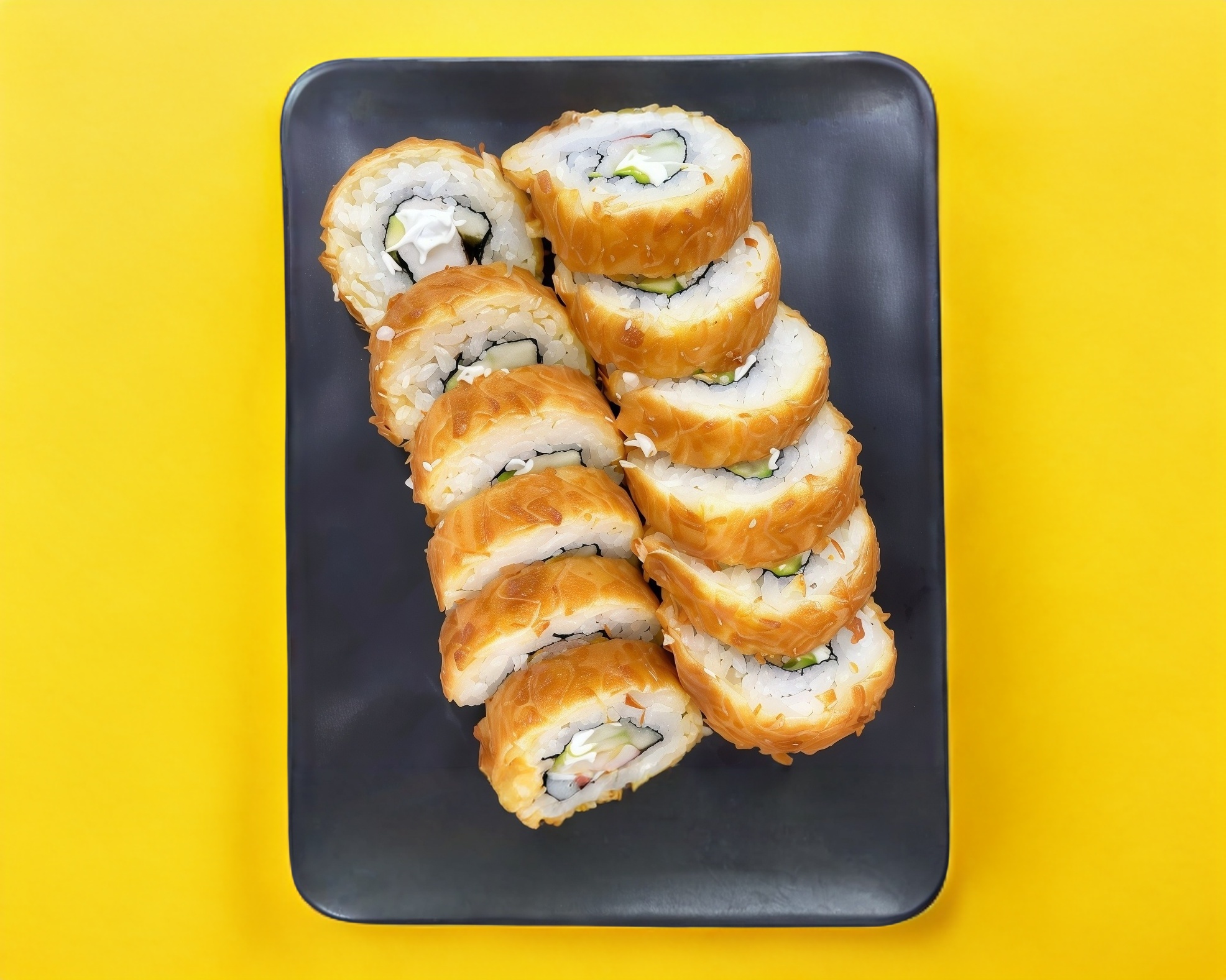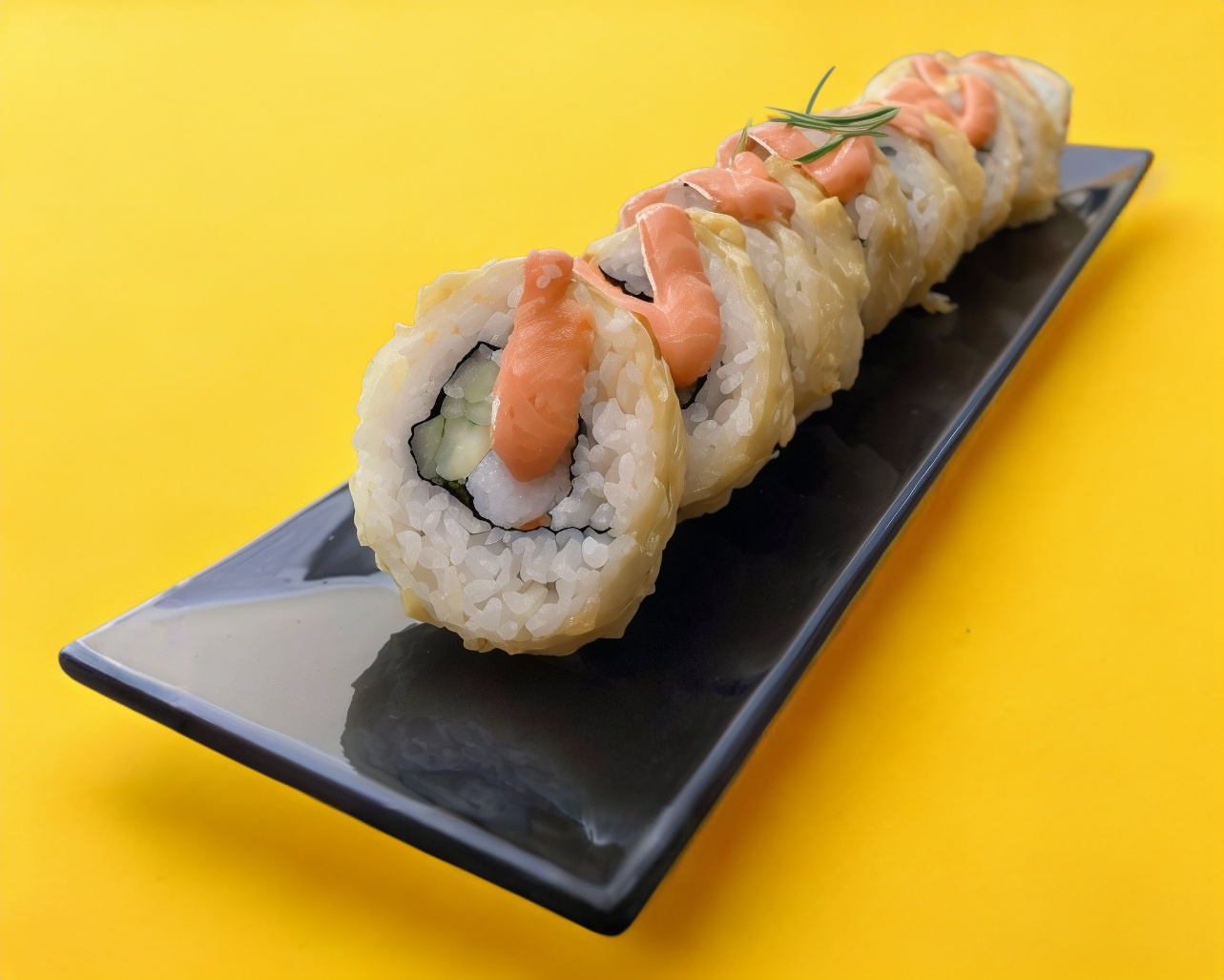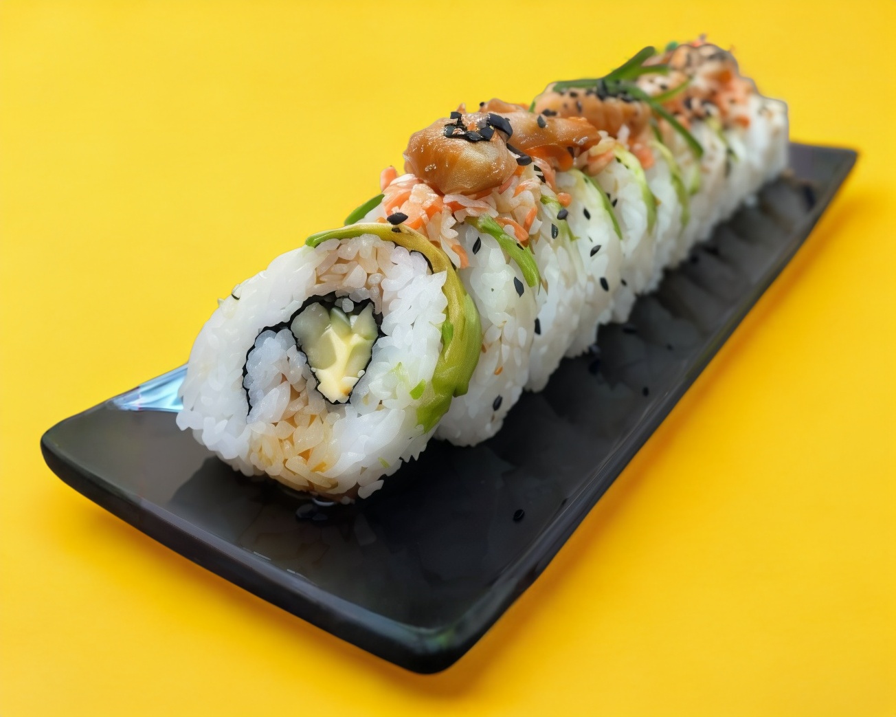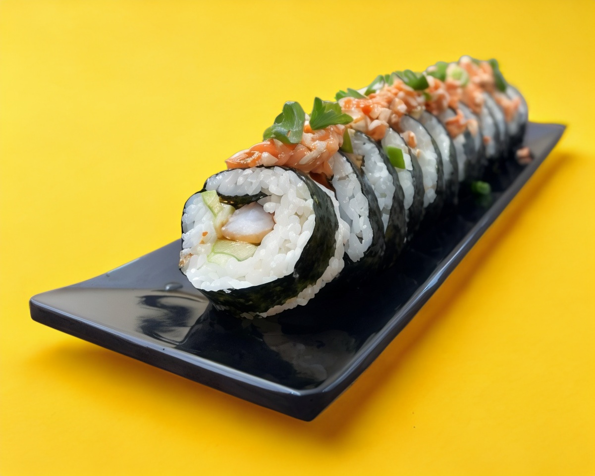 Sushi gigante empanizado por fuera, por dentro aguacate, pepino, philadelphia, camarón y tocino. Por fuera coronado con queso gratinado, res, salsa de anguila sriracha y cebollín