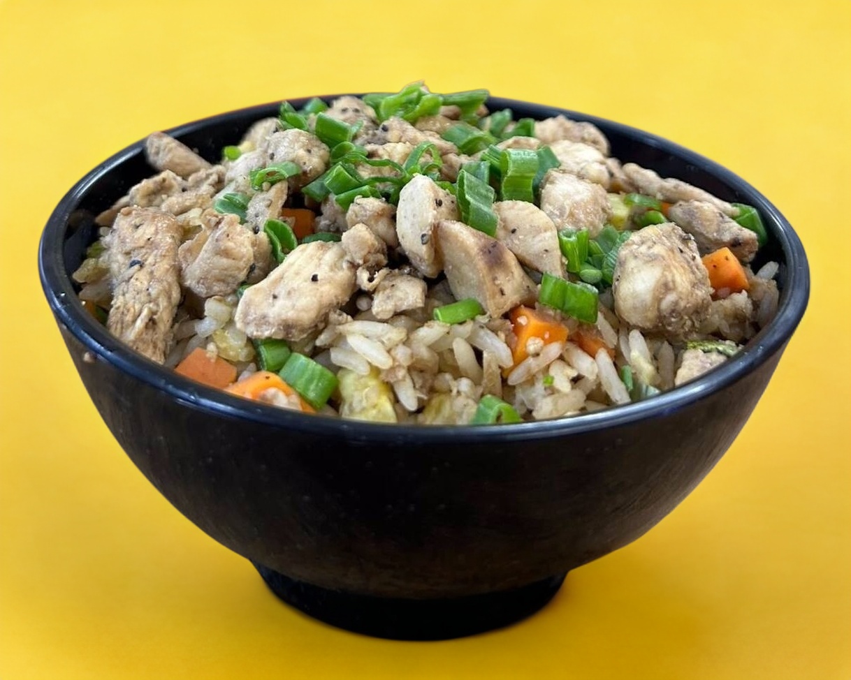 Gohan con pollo, brócoli, piña, salsa teriyaki y ajonjoli