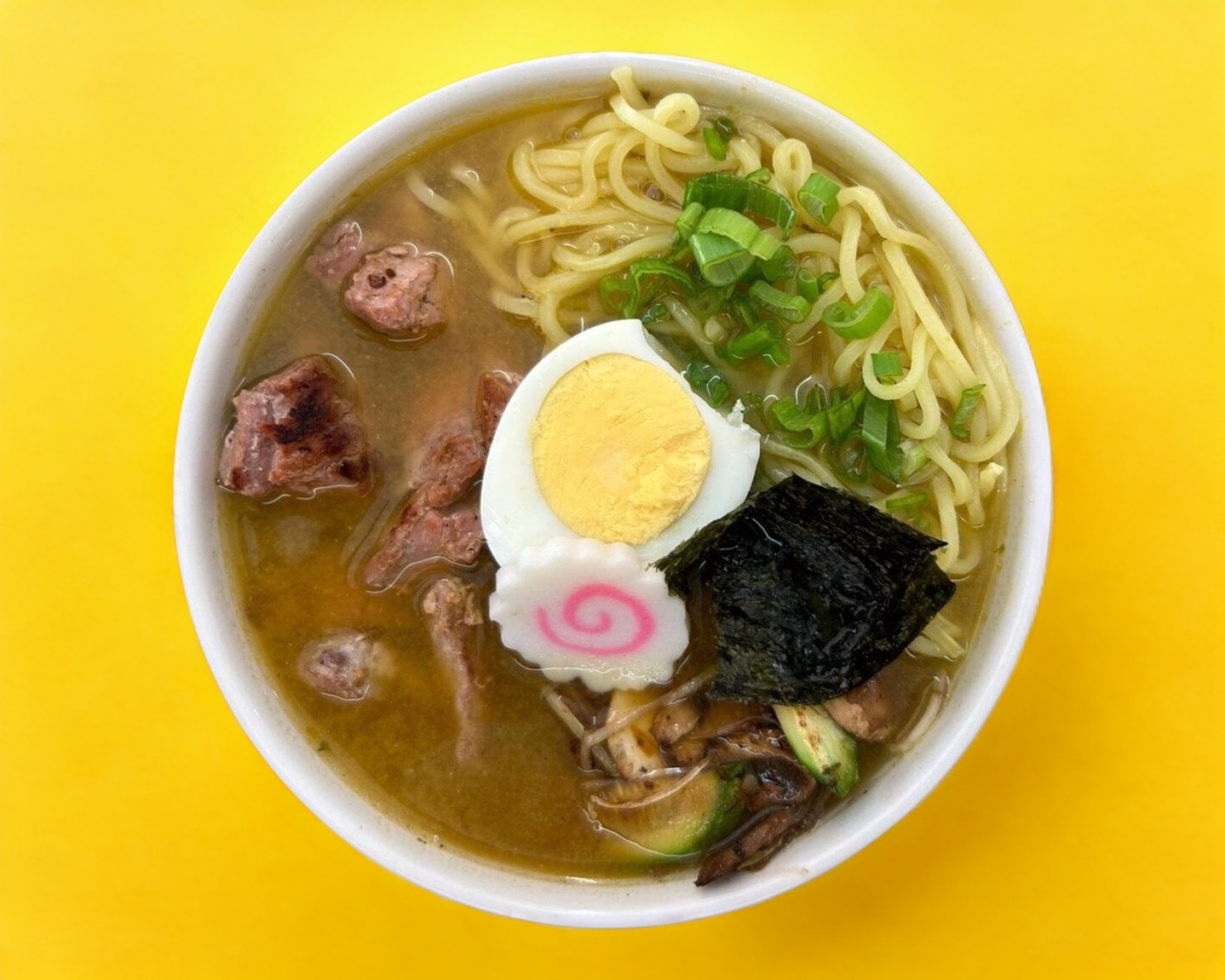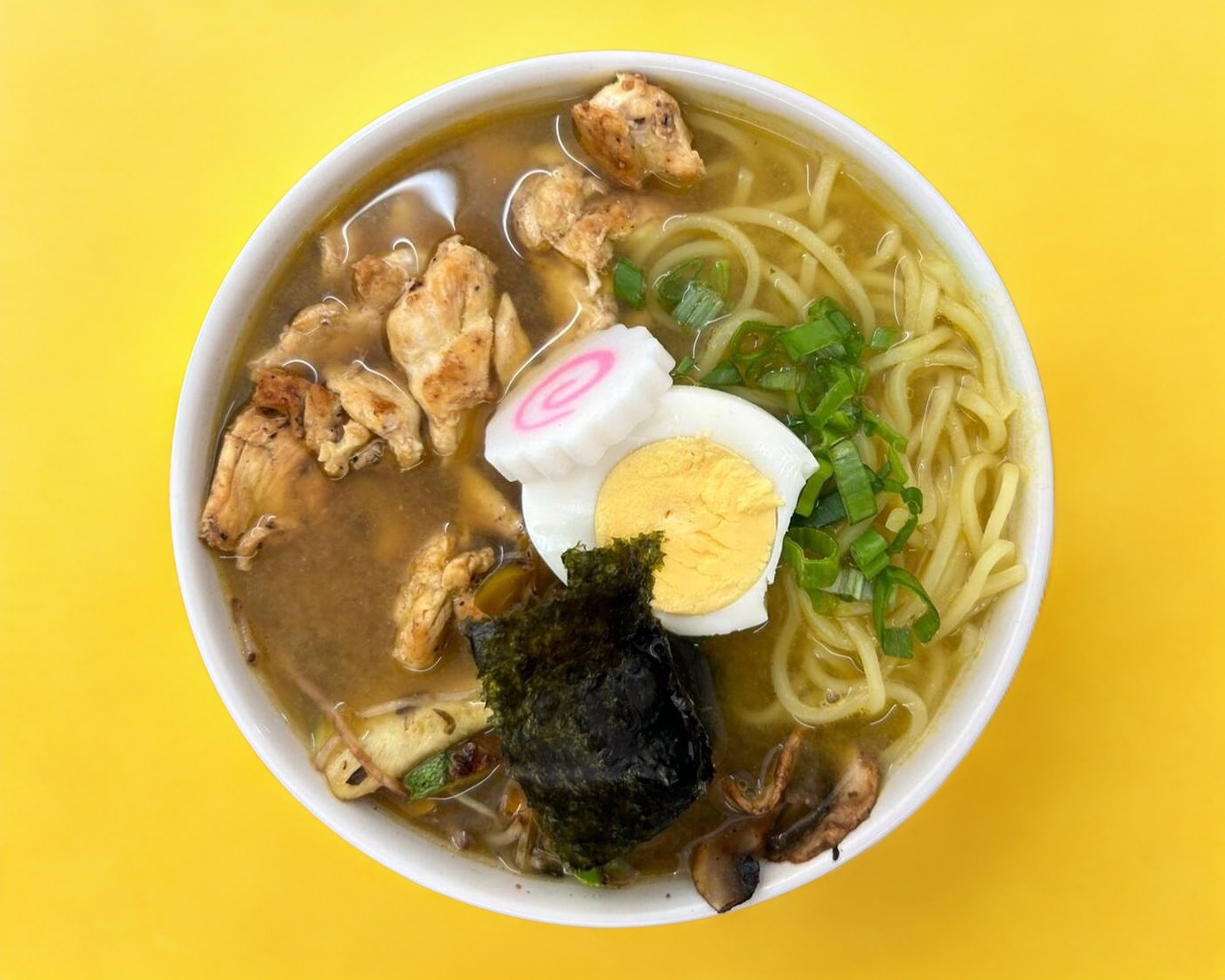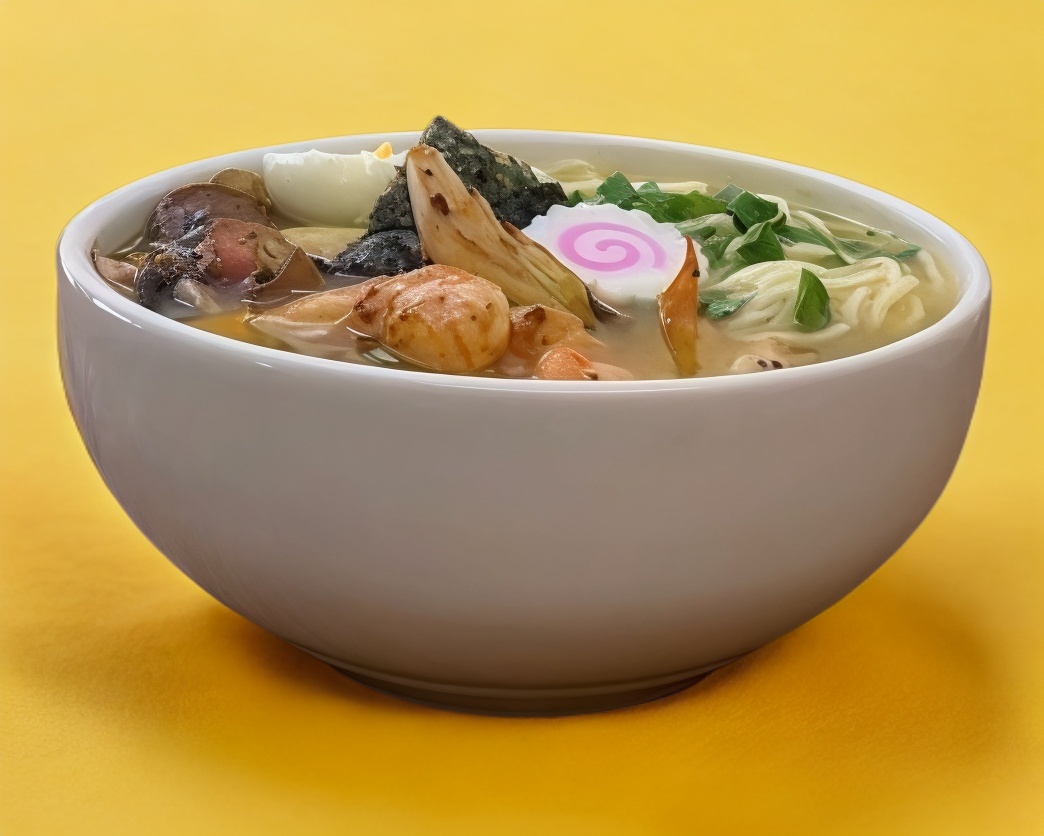 Delicioso caldo con verdura, huevo cocido, pasta, naruti y proteína