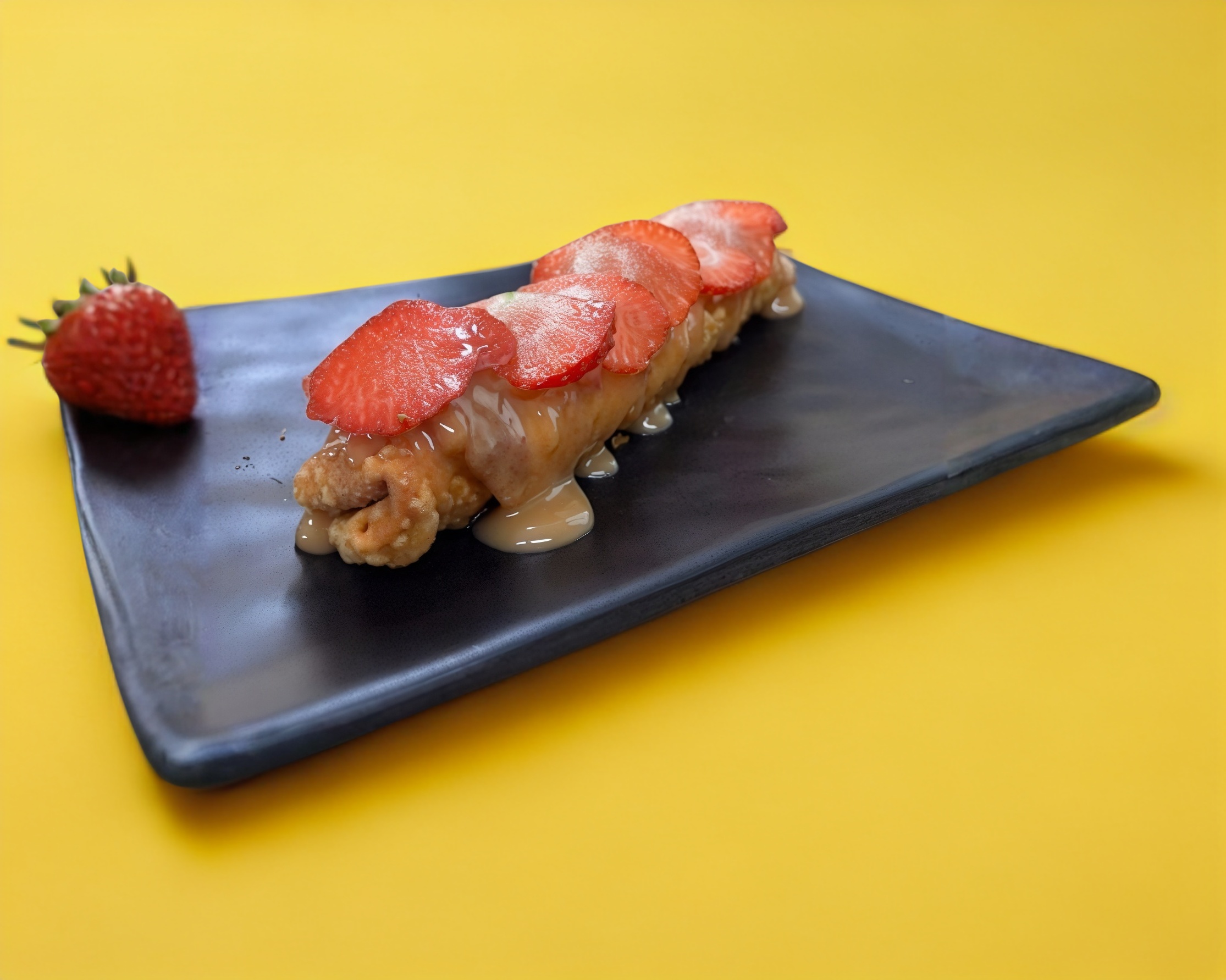 Egg roll frito, relleno de philadelphia con un toque de cajeta y fresas
