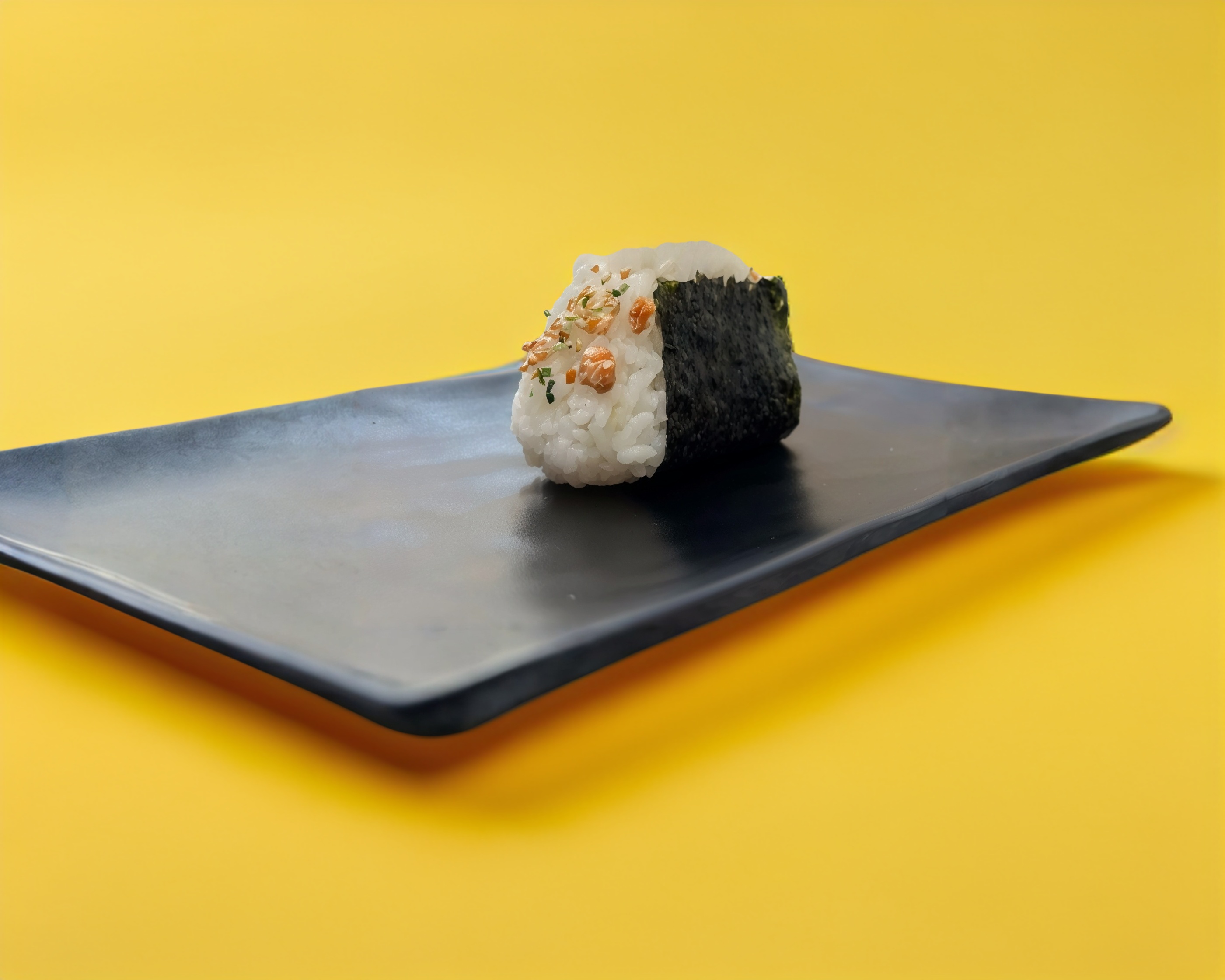 Alga por fuera, por dentro camarones empanizados, aguacate, pepino y philadelphia, coronado con ensalada kani y cebollín