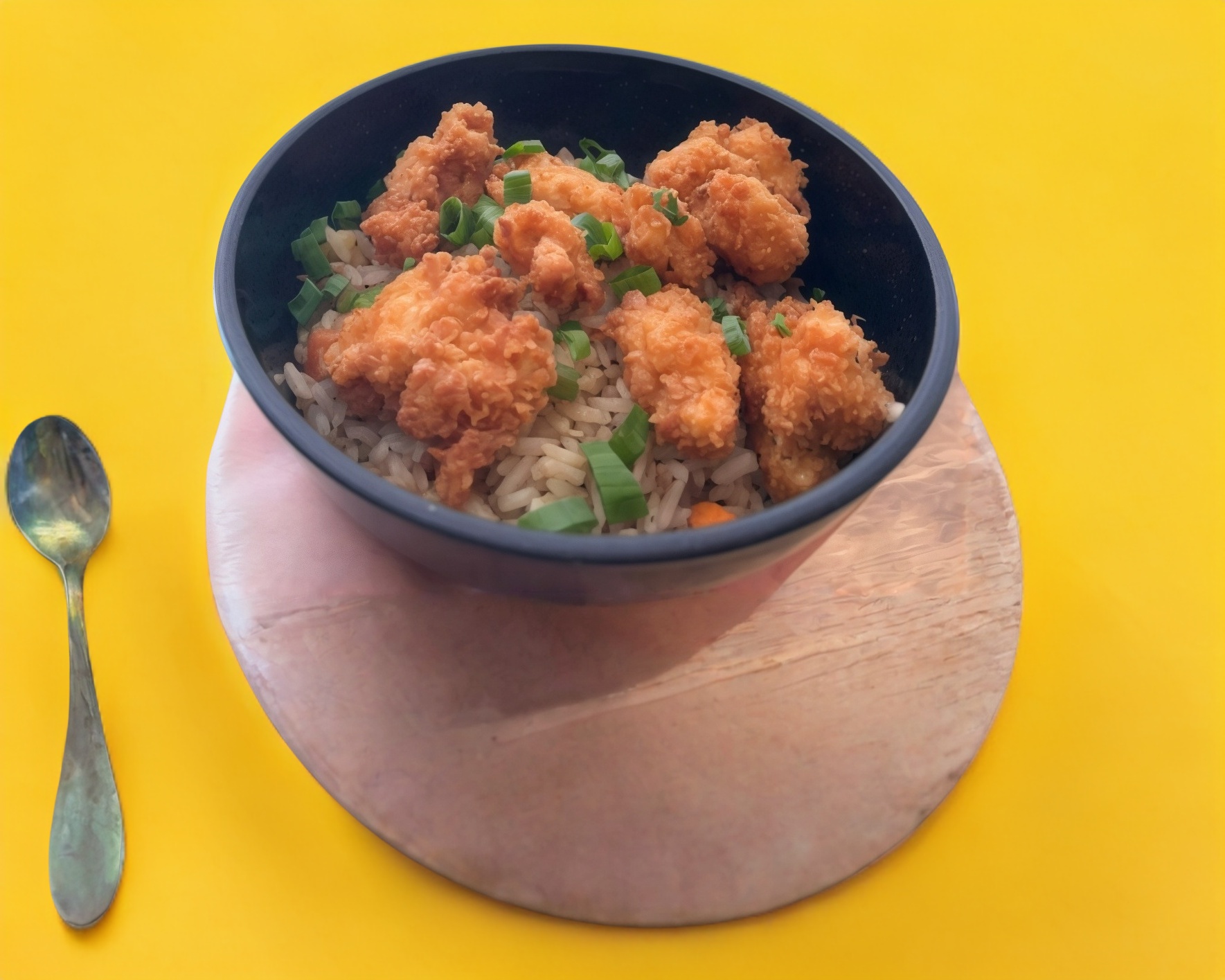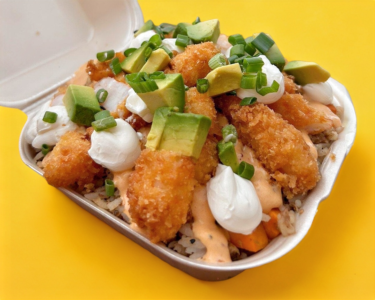 Arroz frito coronado con aderezo chipotle, camarones empanizados, philadelphia y aguacate.