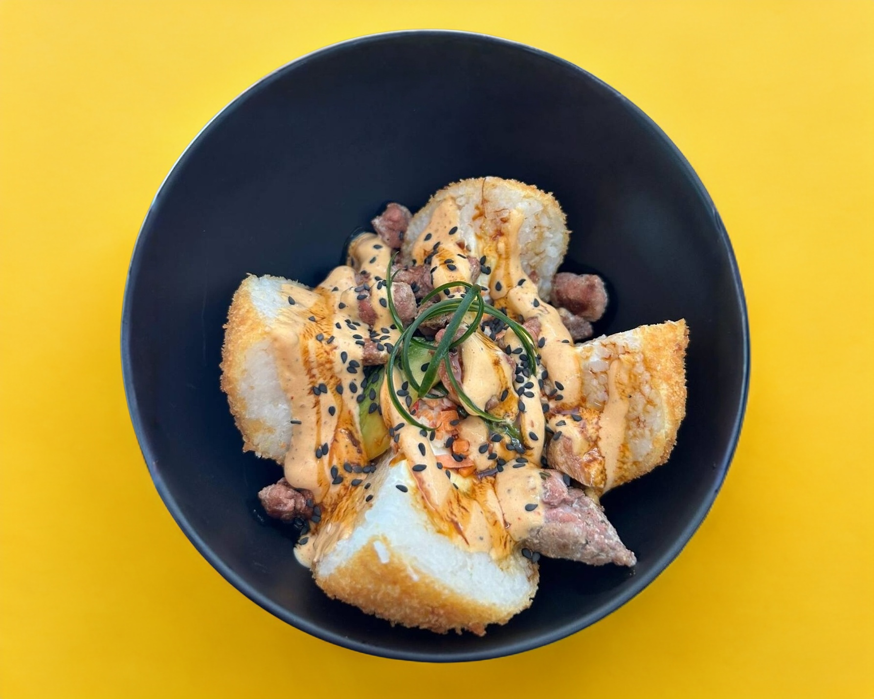 Bola de arroz empanizada rellena de philadelphia, coronada con ensalada kani, aguacate, proteína (opcional), aderezo chipotle, salsa de anguila y ajonjolí.