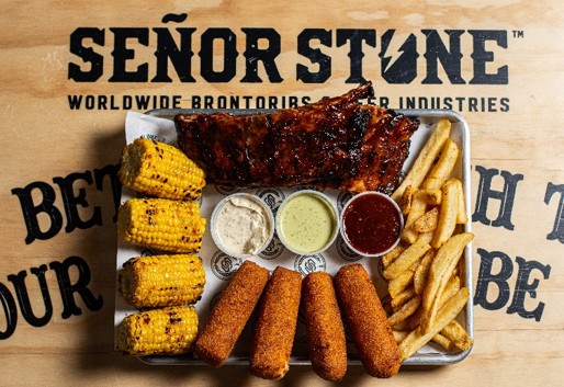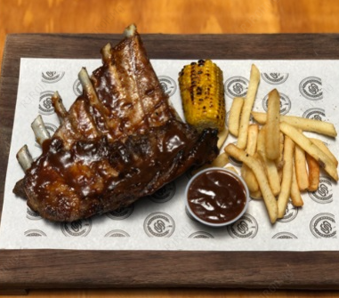 Delicioso costillar de brontosaurio (no cierto es de cerdo) de 900 g, 3 sabores a elegir. Viene con papas a la francesa, elote dulce, macarrones con queso y 2 bollitos.