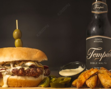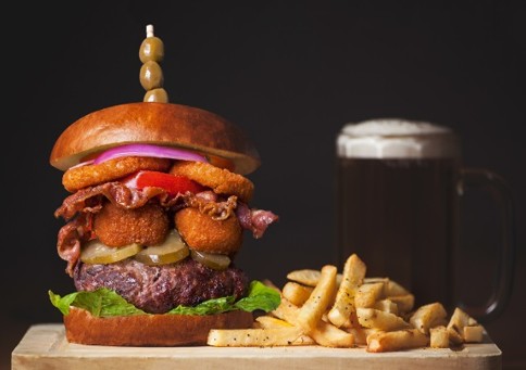 Hamburguesa 280 g de carne con dedos de queso, aros de cebolla, queso americano, tocino, jitomate, lechuga y cebolla acompañado de papas.