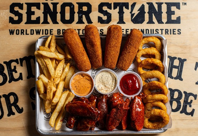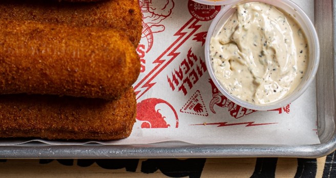 Paquete de 10 alitas, 4 dedos de queso, 250 g de papas de tu elección y 10 aros de cebolla.