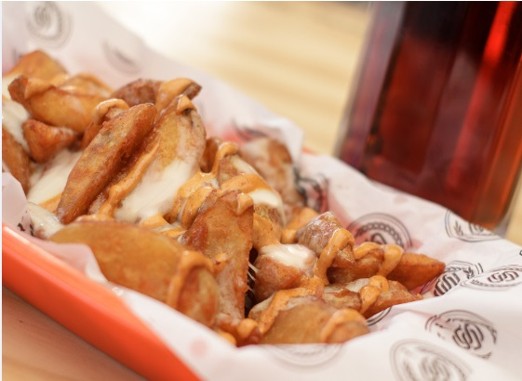 Papas gajo gratinadas con queso y aderezo chipotle.