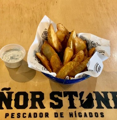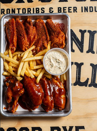 Orden de 10 alitas bañadas con salsa a elección, acompañadas con delgadas papas a la francesa, como las extintas papatinas y 1 aderezo ranch.