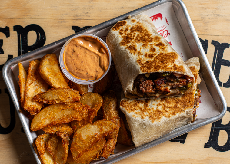 Burrito gigante con arrachera, morrón, queso, cebolla, tocino, frijoles acompañado de papas gajo. (Sin modificación de ingredientes)