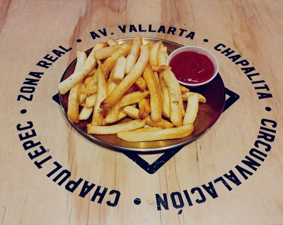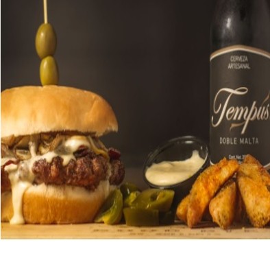 Hamburguesa de 140 g de carne selecta con salsa de queso, champiñones salteados acompañada de papas a la francesa.