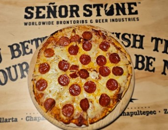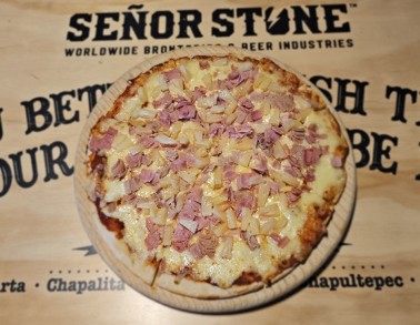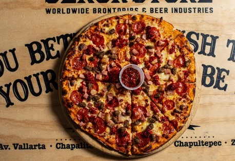 Pizza con queso mozzarella, salsa muy picante, salchicha, tocino, jamón, pepperoni y chorizo. (consejo: si no te gusta el picante pide la salsa aparte)