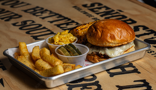 Sándwich bañado en salsa BBQ, acompañado con side de macarrones, pepinillos caseros, papas a la francesa y medio elote dulce.