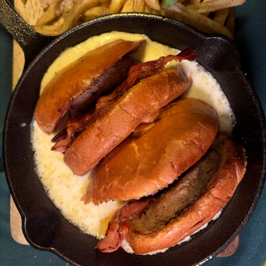 Hamburguesa con doble carne de res (150 g c/u) y tocino sobre fondue, acompañada de papas a la francesa.