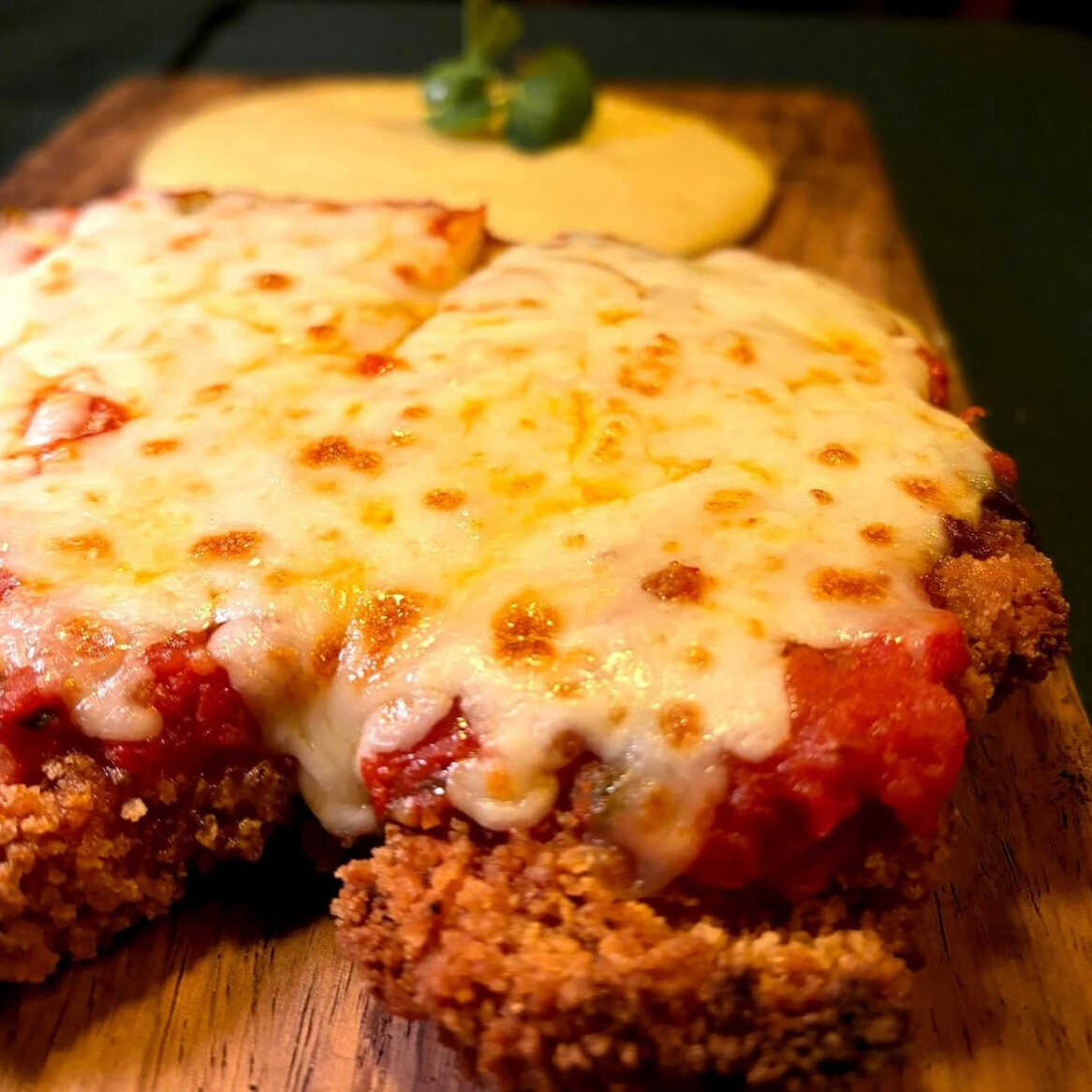 200 g De pechuga de pollo empanizada con salsa pomodoro gratinada con queso mozzarella acompañado con un terso de puré de papa.