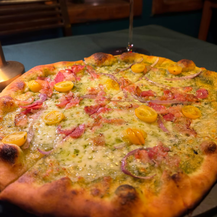 Pizza de 30 cm con base de pesto, mozzarella, tocino, cebolla morada y tomates cherry.
