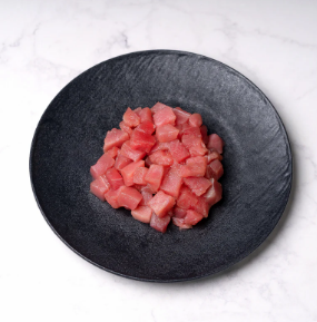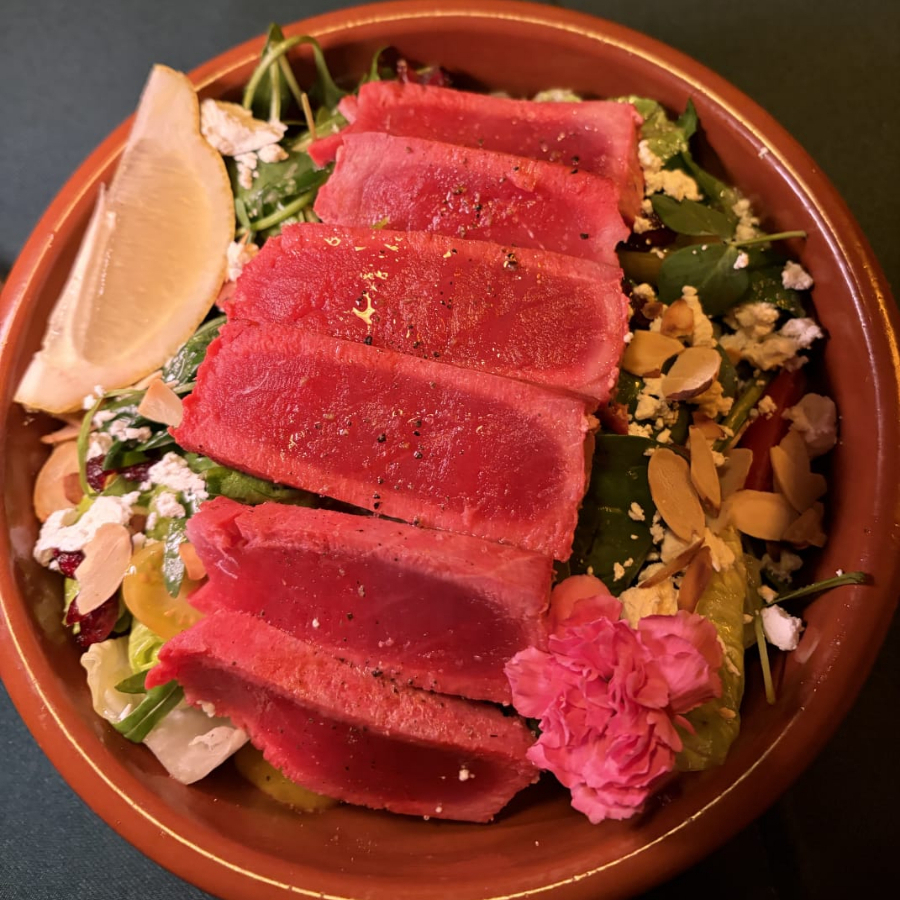 Atún sellado (150 g) con lechuga, arúgula baby, vinagreta de piña y jengibre, arándanos, queso de cabra y frutas de temporada.