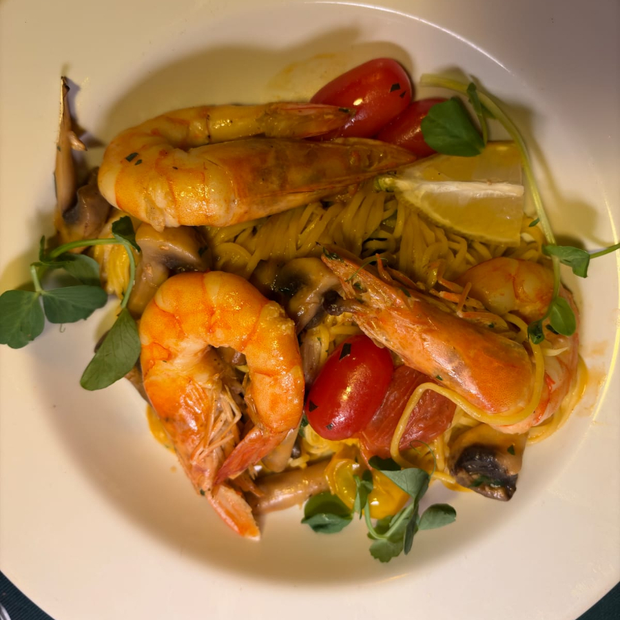 Pasta fresca hecha en casa (200 g) con camarones, salsa de mezcal, champiñones, tomates cherry, limón y toque de chile serrano.