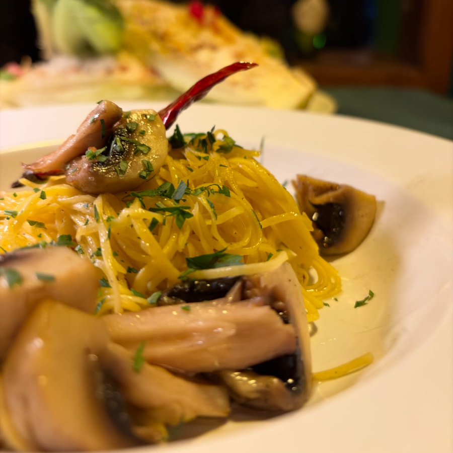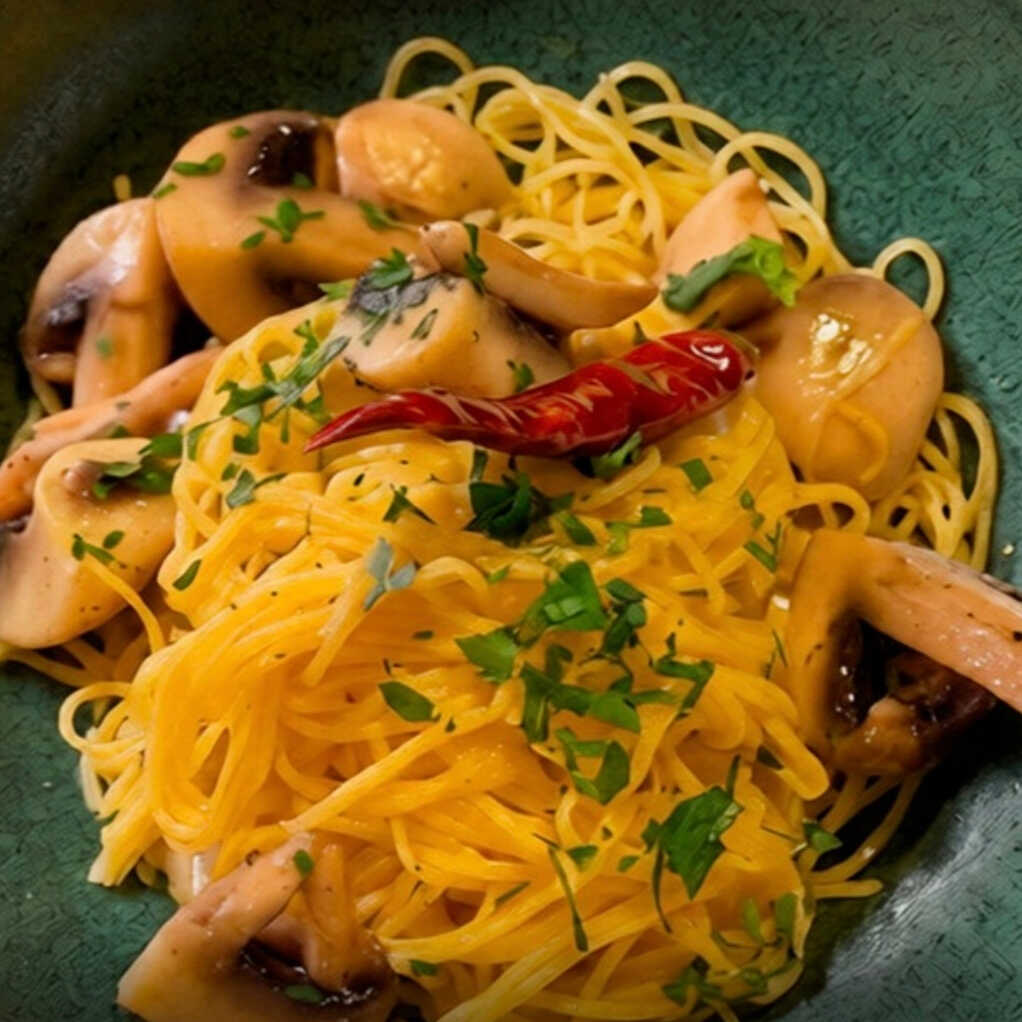 Pasta fresca hecha en casa (200 g) con champiñones, ajo, perejil y toque de chile de árbol.