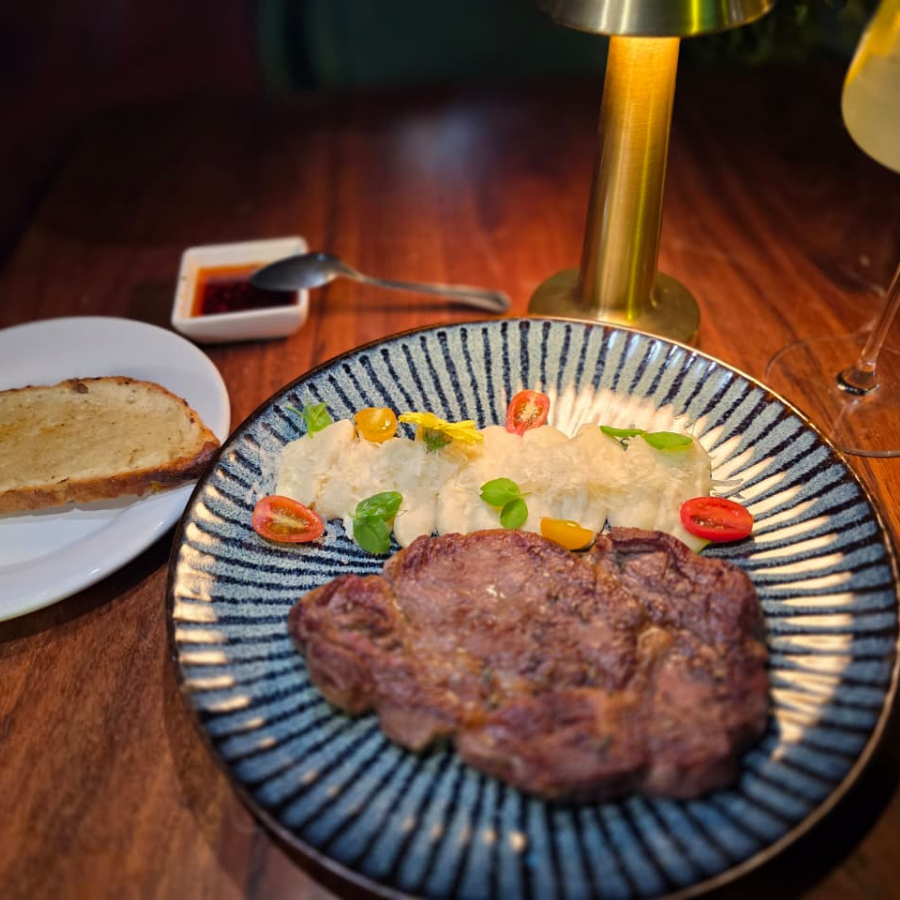 300 g De rib eye al sartén con mantequilla, ajo y hierbas italianas acompañado con un terso de puré de papa.