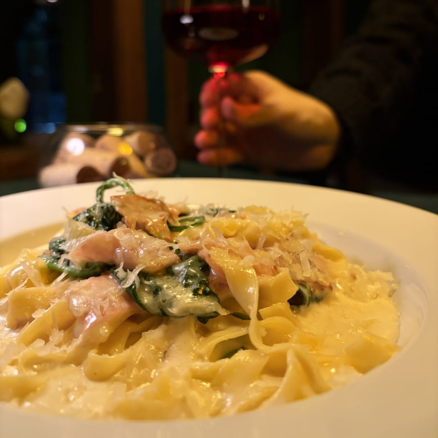 Pasta fresca hecha en casa (200 g) con jamón York, espinaca fresca en salsa cremosa y toque de poro confitado.