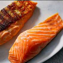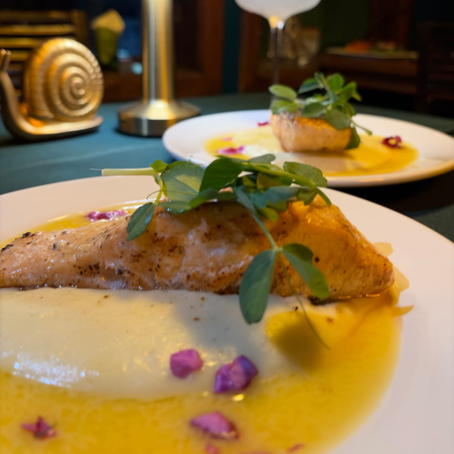 200 g De salmón fresco sobre una cama terso puré de papa con una salsa a base de mantequilla, limón y parmesano.